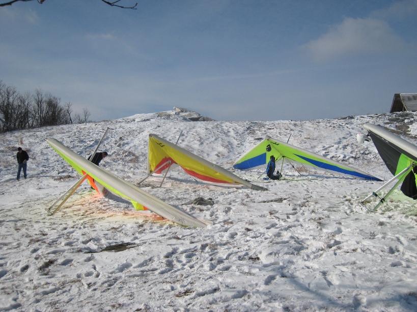 I arrived shorty after 1030AM to see 3 crazy pilots setting up their hang gliders in 28 degree weather. It was too friggin cold for me to setup, so I was going to do the fetch pilots thing. After a trip to the LZ to drop off cars I decided to go ahead and setup (It was much warmer in the LZ). The short of it is I launched and with a few angel breaths (tiny thermals) I sledded to the primary. Feet wet and cold I headed home. Thanks for the ride to the top Mark and DavidB for the launch assist. See y'all in the spring, at Demo days or an unseasonably warm flying day.