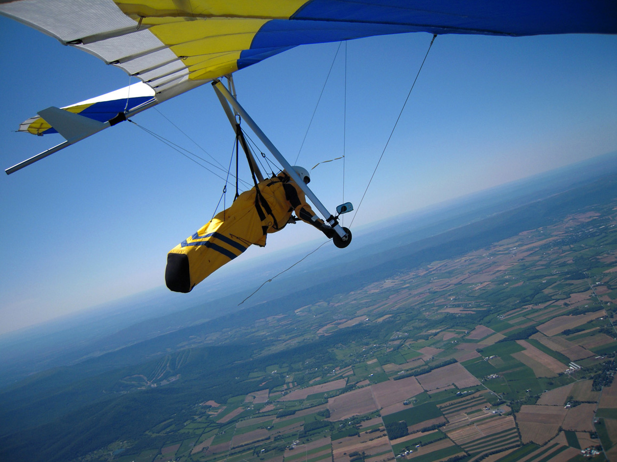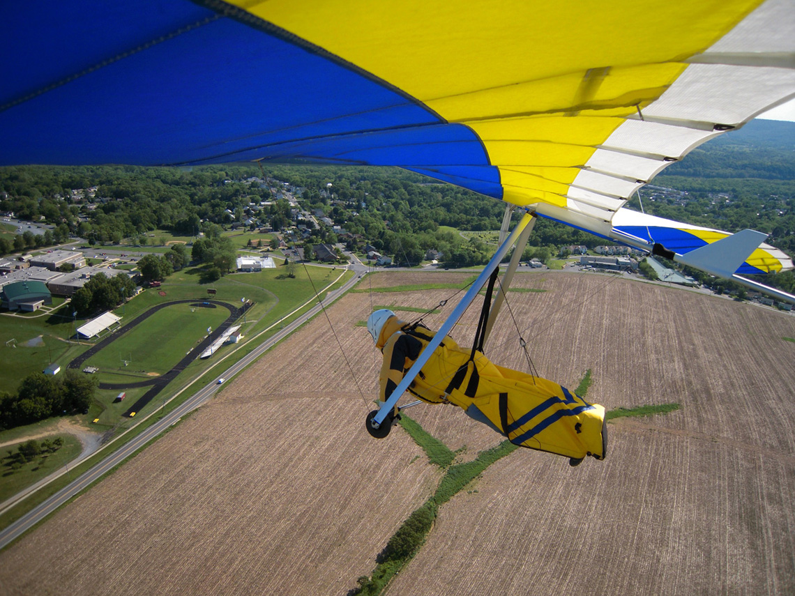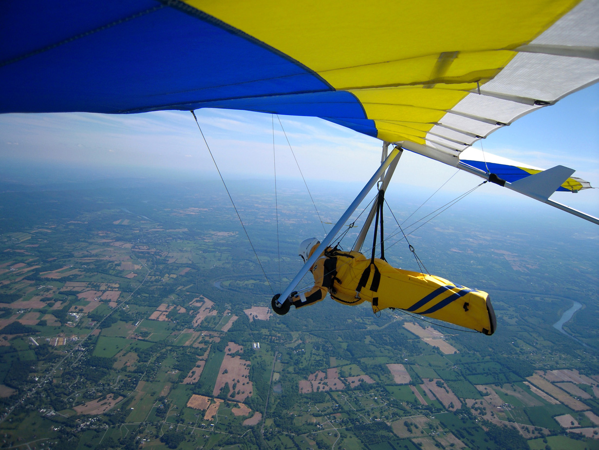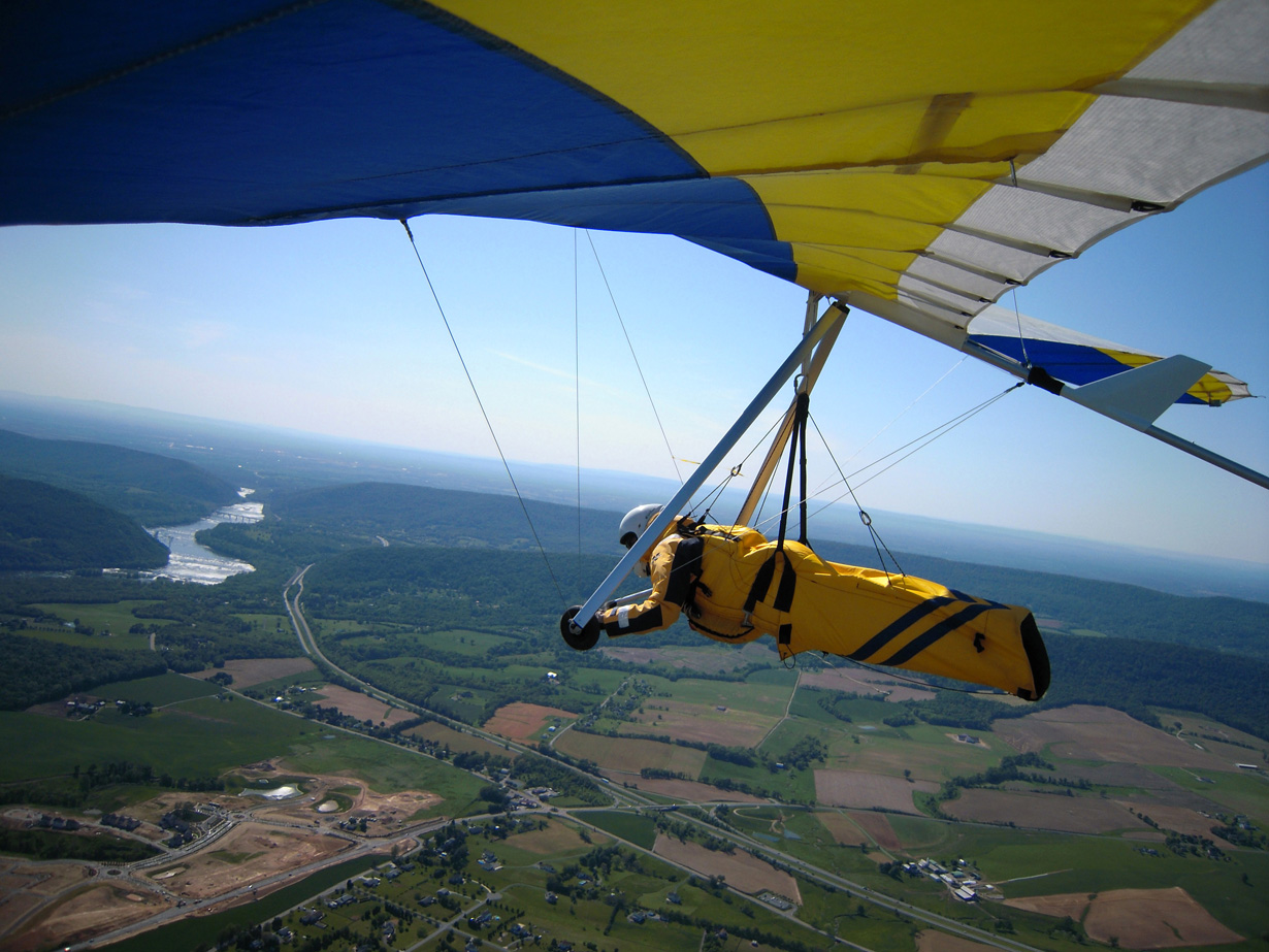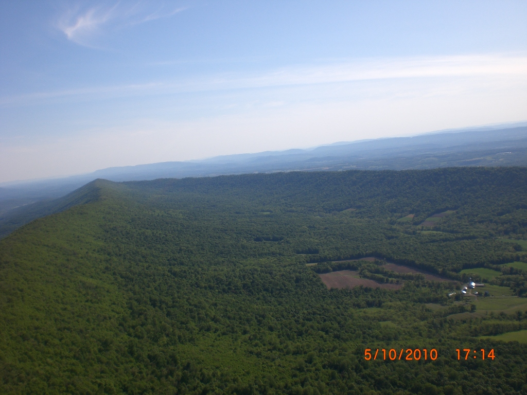 Great day at the Pulpit, although it didn’t start out that way. With Bacil’s help, I launched from the pad just after 2 PM into a straight-in 15 mph window after waiting out a 45-degree north-cross cycle for 15 minutes. The next ½ hr on the ridge was basically occupied with trying to stay in short bursts of lift followed by running from equally intense blasts of gravity. At best, all I had to show for it was a series of brief 500 ft gains above launch. Not much fun for a lot of intense work. After watching Brian Leisenring get drilled to the point where landing in the secondary was his only option, I decided that if I was lucky enough to find a thermal large enough to accommodate me I would “turn tail” and head for a large field on the other side of the ridge to end what was quickly developing into a Monday afternoon spanking. About 5 minutes later, I found one (~¼ mile south of launch) and followed it, climbing to 4,300 ft MSL over the second lee-side ridge. I radioed Bacil and Larry (who had already crossed the valley and was now cruising over the Michaux forest at 6,500 plus ft MSL) to let them know where I was. Larry radioed back with advice that I had already burned into my memory after reading his accounts of several of his remarkable XC flights – “try as hard as possible to stick with the thermal that your in cause it just may be your last one of the day!” With this “mind set” I stayed with the thermal until I lost it just west of route 75. After several attempts at relocating it, I headed south/southeast (down wind) toward Mercersburg. Just east of the High School (~ 3,500 ft MSL), I ran into a thermal that was very different from those that I encountered in front of the ridge. It was remarkably large and well organized. After two or three medium banked 360s in 3 to 5 hundred ft up, I slowly reduced my bank angle to near zero and, as a result, flew out of it and back in with a 180 turn. It was still there! Using this approach, I was able to get a rough idea of it size and strength. I climbed to ~6,500 ft MSL northeast of Mercersburg before I lost it and, at this point, my “plan B” was shelved in favor of the original/long-standing plan – get high and fly far! My direction took me just east of Mercersburg and south along the meandering Conococheague creek. Between thermals, I basically flew fast when the sink alarm went off and slowed down for zero sink. The highest climb came just west of Hagerstown in one of the best thermals that I have ever circled in taking me to 7,509 ft MSL. During one of the 360s, the visual readout on my vario maxed! This thermal reminded me of those that Jonny Durand routinely circles in while casually discussing the latest HG competition on his Utube videos (you know, the ones were he talks about today’s task while his vario is screaming in the background for minutes!). From this climb, I flew just west of the route 81 - 70 interchange and east of where the Conococheague feeds into the Potomac at Williamsport. I found the next big thermal southeast of Williamsport at ~ 4,500 ft MSL and rode it back up to 6,800 ft MSL. By now, the thermals had a more southeasterly drift compared to the earlier south/southeast drift so I adjusted my glides to try and maximize any tail-wind push. This direction took me between Keedysville and Boonsboro following route 67. I found the last significant lift south of Boonsboro and stayed with it until Rohresville. My final glide took me to Brunswick MD and I landed in a large cornfield next to their High School at ~ 5 PM. Bacil picked me up and for that, I owe him “big time”, thanks!! Also, Steven Allgaier and his children greeted me after landing and brought much appreciated gator aid and an energy bar, thanks! What follows are some additional stats recorded from my vario, iphone GPS tracker and photos: Straight-line distance, 44.97 miles; total flight time, 2 hrs 45 min; All blue thermals; Max climb rate, 1,612 ft/min; Max sink rate, 2,681 ft/min. The following photos are in chronological order and except for the takeoff and landing images, they focus is on the significant climbs and some of the glides.