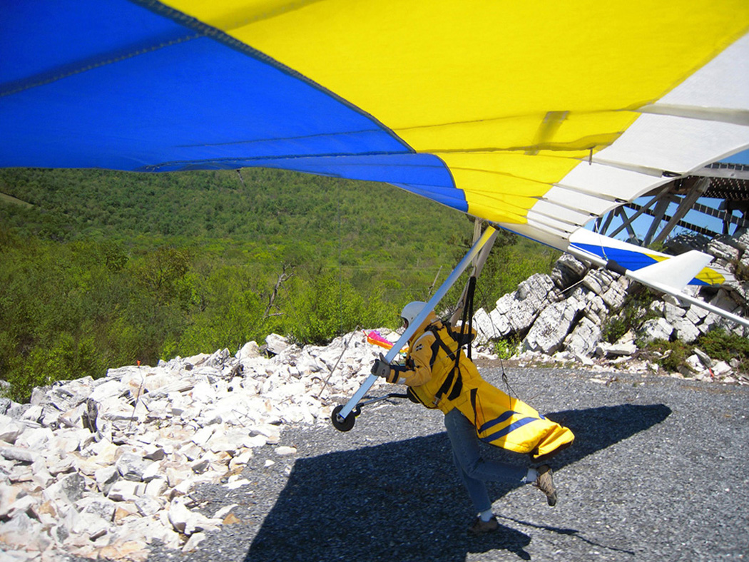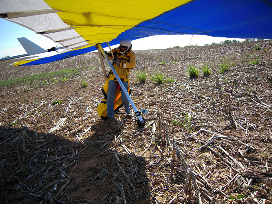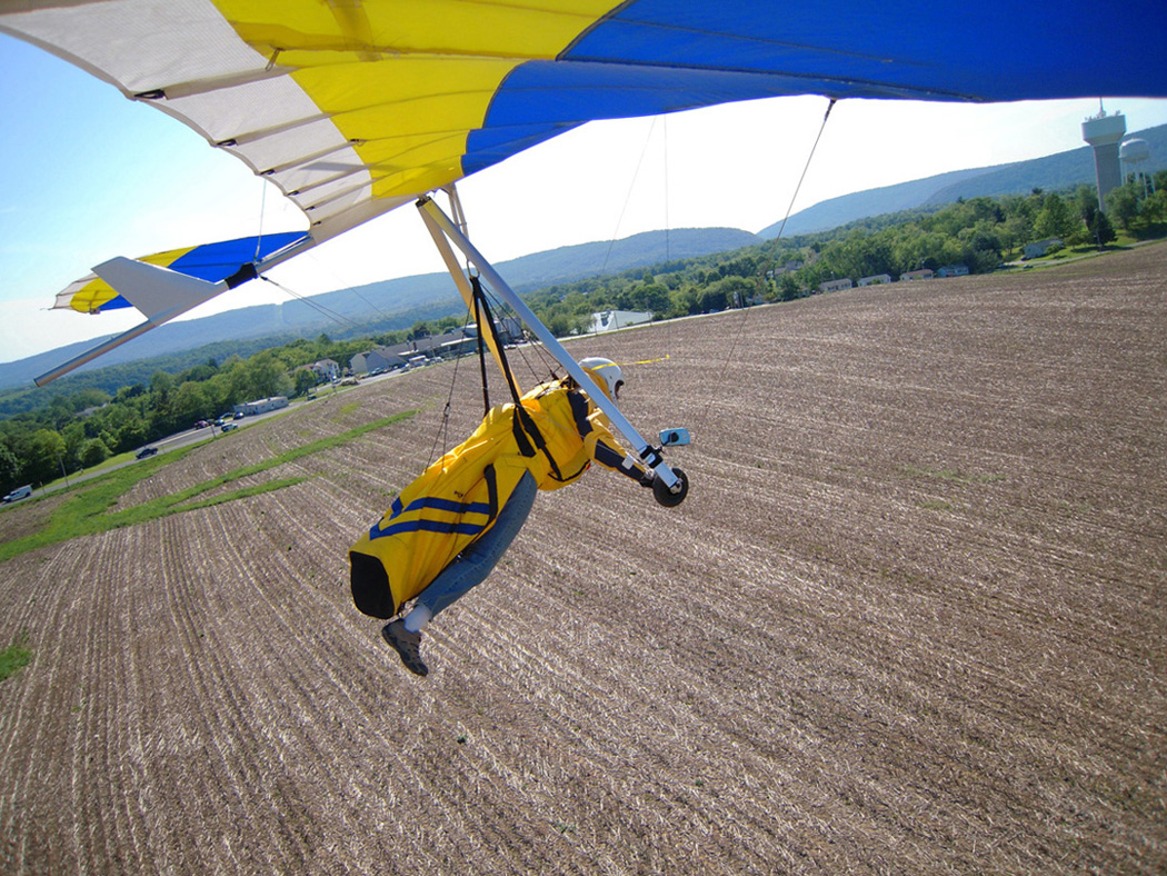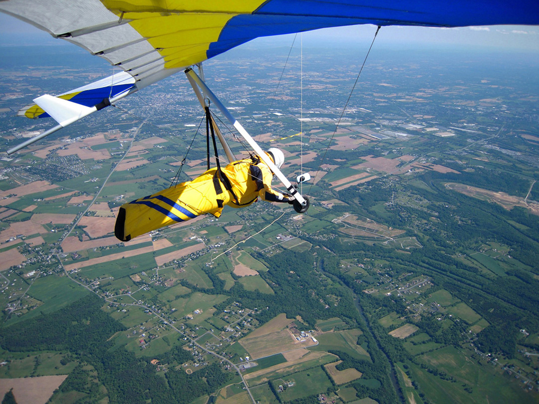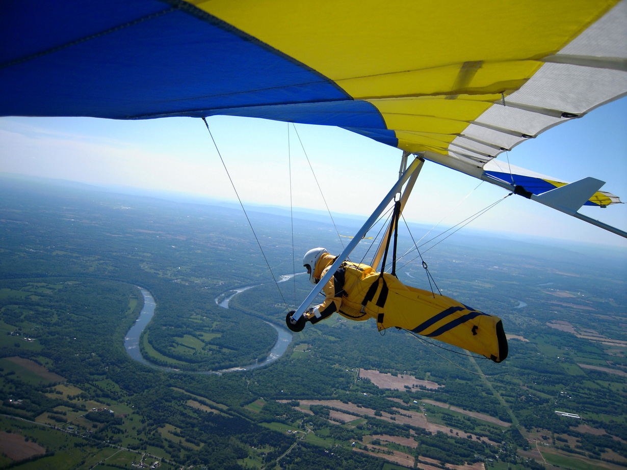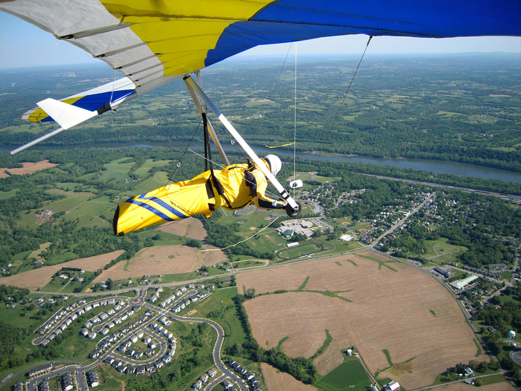 Great day at the Pulpit, although it didn’t start out that way. With Bacil’s help, I launched from the pad just after 2 PM into a straight-in 15 mph window after waiting out a 45-degree north-cross cycle for 15 minutes. The next ½ hr on the ridge was basically occupied with trying to stay in short bursts of lift followed by running from equally intense blasts of gravity. At best, all I had to show for it was a series of brief 500 ft gains above launch. Not much fun for a lot of intense work. After watching Brian Leisenring get drilled to the point where landing in the secondary was his only option, I decided that if I was lucky enough to find a thermal large enough to accommodate me I would “turn tail” and head for a large field on the other side of the ridge to end what was quickly developing into a Monday afternoon spanking. About 5 minutes later, I found one (~¼ mile south of launch) and followed it, climbing to 4,300 ft MSL over the second lee-side ridge. I radioed Bacil and Larry (who had already crossed the valley and was now cruising over the Michaux forest at 6,500 plus ft MSL) to let them know where I was. Larry radioed back with advice that I had already burned into my memory after reading his accounts of several of his remarkable XC flights – “try as hard as possible to stick with the thermal that your in cause it just may be your last one of the day!” With this “mind set” I stayed with the thermal until I lost it just west of route 75. After several attempts at relocating it, I headed south/southeast (down wind) toward Mercersburg. Just east of the High School (~ 3,500 ft MSL), I ran into a thermal that was very different from those that I encountered in front of the ridge. It was remarkably large and well organized. After two or three medium banked 360s in 3 to 5 hundred ft up, I slowly reduced my bank angle to near zero and, as a result, flew out of it and back in with a 180 turn. It was still there! Using this approach, I was able to get a rough idea of it size and strength. I climbed to ~6,500 ft MSL northeast of Mercersburg before I lost it and, at this point, my “plan B” was shelved in favor of the original/long-standing plan – get high and fly far! My direction took me just east of Mercersburg and south along the meandering Conococheague creek. Between thermals, I basically flew fast when the sink alarm went off and slowed down for zero sink. The highest climb came just west of Hagerstown in one of the best thermals that I have ever circled in taking me to 7,509 ft MSL. During one of the 360s, the visual readout on my vario maxed! This thermal reminded me of those that Jonny Durand routinely circles in while casually discussing the latest HG competition on his Utube videos (you know, the ones were he talks about today’s task while his vario is screaming in the background for minutes!). From this climb, I flew just west of the route 81 - 70 interchange and east of where the Conococheague feeds into the Potomac at Williamsport. I found the next big thermal southeast of Williamsport at ~ 4,500 ft MSL and rode it back up to 6,800 ft MSL. By now, the thermals had a more southeasterly drift compared to the earlier south/southeast drift so I adjusted my glides to try and maximize any tail-wind push. This direction took me between Keedysville and Boonsboro following route 67. I found the last significant lift south of Boonsboro and stayed with it until Rohresville. My final glide took me to Brunswick MD and I landed in a large cornfield next to their High School at ~ 5 PM. Bacil picked me up and for that, I owe him “big time”, thanks!! Also, Steven Allgaier and his children greeted me after landing and brought much appreciated gator aid and an energy bar, thanks! What follows are some additional stats recorded from my vario, iphone GPS tracker and photos: Straight-line distance, 44.97 miles; total flight time, 2 hrs 45 min; All blue thermals; Max climb rate, 1,612 ft/min; Max sink rate, 2,681 ft/min. The following photos are in chronological order and except for the takeoff and landing images, they focus is on the significant climbs and some of the glides.