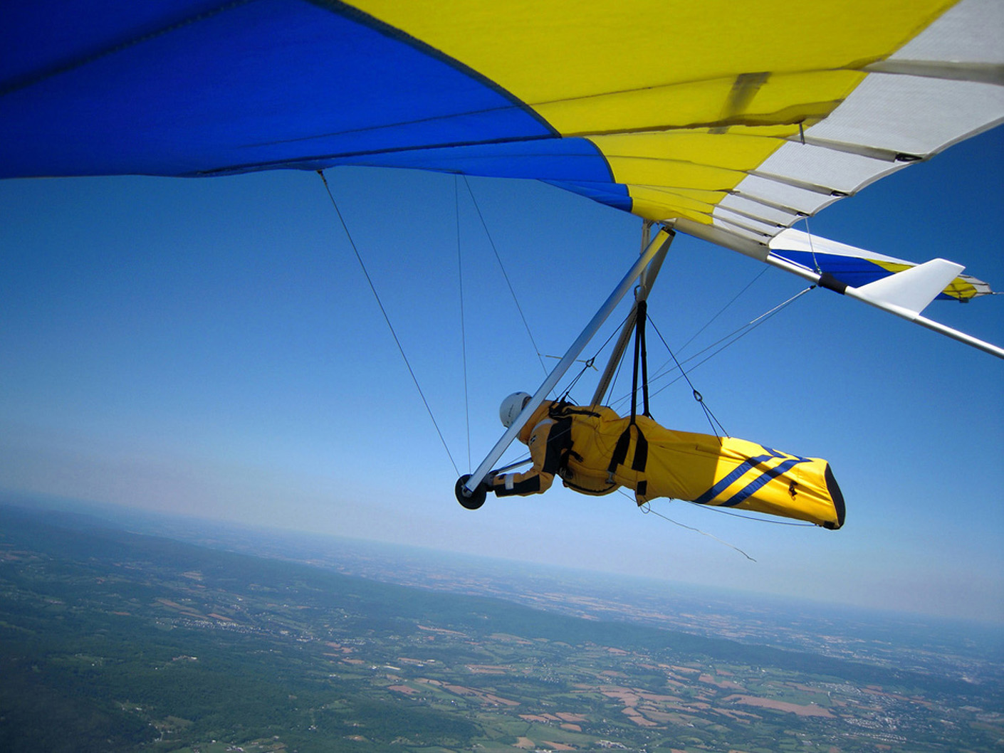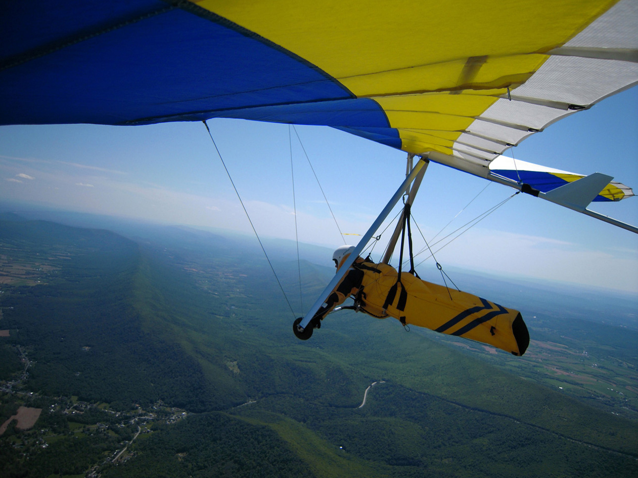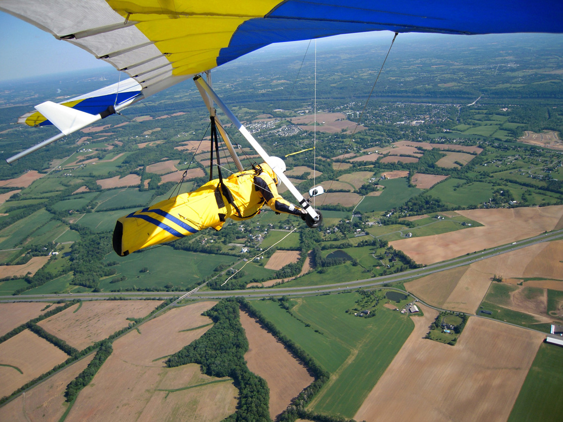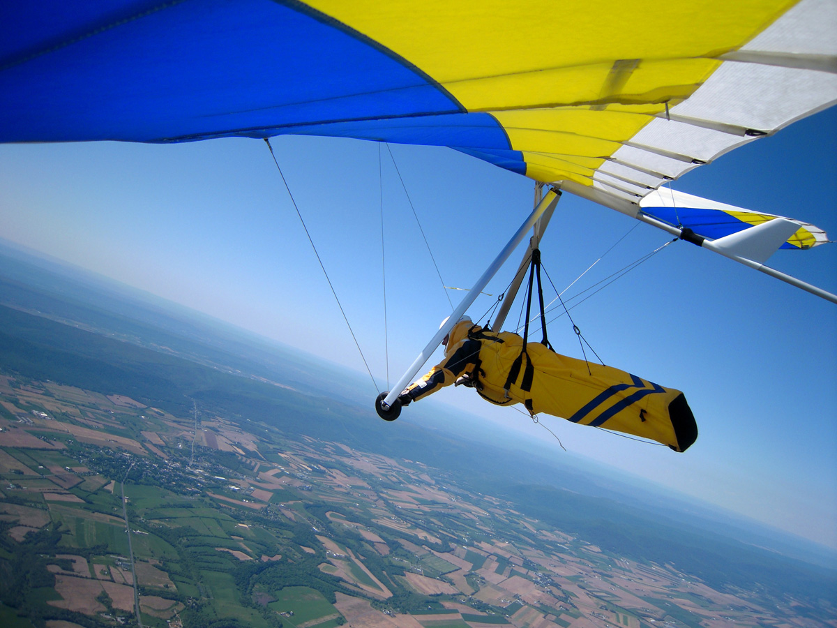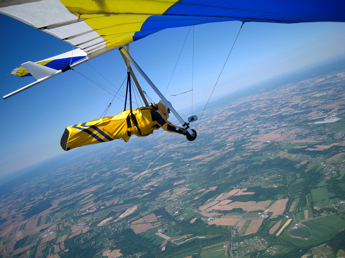 Great day at the Pulpit, although it didn’t start out that way. With Bacil’s help, I launched from the pad just after 2 PM into a straight-in 15 mph window after waiting out a 45-degree north-cross cycle for 15 minutes. The next ½ hr on the ridge was basically occupied with trying to stay in short bursts of lift followed by running from equally intense blasts of gravity. At best, all I had to show for it was a series of brief 500 ft gains above launch. Not much fun for a lot of intense work. After watching Brian Leisenring get drilled to the point where landing in the secondary was his only option, I decided that if I was lucky enough to find a thermal large enough to accommodate me I would “turn tail” and head for a large field on the other side of the ridge to end what was quickly developing into a Monday afternoon spanking. About 5 minutes later, I found one (~¼ mile south of launch) and followed it, climbing to 4,300 ft MSL over the second lee-side ridge. I radioed Bacil and Larry (who had already crossed the valley and was now cruising over the Michaux forest at 6,500 plus ft MSL) to let them know where I was. Larry radioed back with advice that I had already burned into my memory after reading his accounts of several of his remarkable XC flights – “try as hard as possible to stick with the thermal that your in cause it just may be your last one of the day!” With this “mind set” I stayed with the thermal until I lost it just west of route 75. After several attempts at relocating it, I headed south/southeast (down wind) toward Mercersburg. Just east of the High School (~ 3,500 ft MSL), I ran into a thermal that was very different from those that I encountered in front of the ridge. It was remarkably large and well organized. After two or three medium banked 360s in 3 to 5 hundred ft up, I slowly reduced my bank angle to near zero and, as a result, flew out of it and back in with a 180 turn. It was still there! Using this approach, I was able to get a rough idea of it size and strength. I climbed to ~6,500 ft MSL northeast of Mercersburg before I lost it and, at this point, my “plan B” was shelved in favor of the original/long-standing plan – get high and fly far! My direction took me just east of Mercersburg and south along the meandering Conococheague creek. Between thermals, I basically flew fast when the sink alarm went off and slowed down for zero sink. The highest climb came just west of Hagerstown in one of the best thermals that I have ever circled in taking me to 7,509 ft MSL. During one of the 360s, the visual readout on my vario maxed! This thermal reminded me of those that Jonny Durand routinely circles in while casually discussing the latest HG competition on his Utube videos (you know, the ones were he talks about today’s task while his vario is screaming in the background for minutes!). From this climb, I flew just west of the route 81 - 70 interchange and east of where the Conococheague feeds into the Potomac at Williamsport. I found the next big thermal southeast of Williamsport at ~ 4,500 ft MSL and rode it back up to 6,800 ft MSL. By now, the thermals had a more southeasterly drift compared to the earlier south/southeast drift so I adjusted my glides to try and maximize any tail-wind push. This direction took me between Keedysville and Boonsboro following route 67. I found the last significant lift south of Boonsboro and stayed with it until Rohresville. My final glide took me to Brunswick MD and I landed in a large cornfield next to their High School at ~ 5 PM. Bacil picked me up and for that, I owe him “big time”, thanks!! Also, Steven Allgaier and his children greeted me after landing and brought much appreciated gator aid and an energy bar, thanks! What follows are some additional stats recorded from my vario, iphone GPS tracker and photos: Straight-line distance, 44.97 miles; total flight time, 2 hrs 45 min; All blue thermals; Max climb rate, 1,612 ft/min; Max sink rate, 2,681 ft/min. The following photos are in chronological order and except for the takeoff and landing images, they focus is on the significant climbs and some of the glides.