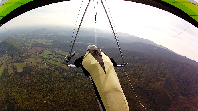 A beautiful day to be outside. Met up with Dan and Jon at 12:30P at the bottom. They splinted their gliders to the ladder and we and my driver wife slowly 4WDed it up to the top. The road is really washed out in spots before the switchback at the top. At the top conditions were soarable and nice and smooth. As we set up some high clouds moved in and diminished the frequency and amplitude of the cycles. The sun came back out and things looked better but not as good as earlier. Dan took off first just after 3P with a great launch and worked hard to get up above the mountain. A light thermal out in front of the slot enabled him to figure 8 at first in the weak lift but he stuck to it and got up. I got on launch and waited for a cycle. A light one percolated and I committed to the launch. After getting airborne the right wing came up so slightly but my initial roll input did not roll it level. As a result I started drifting towards the trees on the left side of the slot. I pulled in a little and the second attempt rolled it level. It was good that conditions were quite smooth and light. Flew out of the slot and headed west to look for some lift. Turned back at the corner and headed back by launch but I was quite below launch level. Headed out and had a nice landing on the spine of the "south" field. Looked up and saw Dan at 1K'+ over. Jon took off shortly after I landed and got up. He and Dan shared the sky until Dan landed around 4:20P; Jon put down around 4:45P. Randy Weber and Mike Cosner showed up at launch after I had taken off. They both launched and got up as I packed up and loaded the plowhorse that scaled the rocky road to launch. Judy and I then headed to the Early Mountain Winery just east of Wolftown on Rt. 230. Got a table out on the patio and ordered some food and some wine. Dan and Jon joined us just before closing time at 6P. We watched the sunset drinking some fine Virginia wine and eating a fine cheese plate. A fitting end to a nice day. Bacil