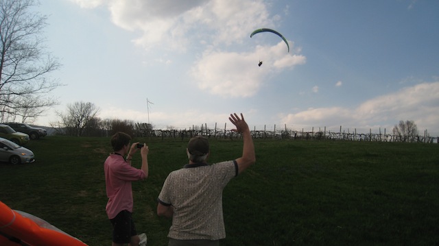 It was a spectacular day at North Mountain Vineyards yesterday. Bacil had set up his glider and was explaining the basics of free flight to all and sundry who came within earshot. He even convinced a few rapt listeners to try a tandem at Highland Aerosports. Later in the afternoon, as Bacil joined the rest of us for a wine-tasting (at the very reasonable price of $5 per person), Matt made an unheralded arrival after taking off earlier from Edith’s Gap. This was the first paragliding landing at North Mountain Vineyards. Bacil, who had landed here in 2013 and earlier, joined a few of us who went outside to congratulate Matt. While Matt was packing up, another paraglider appeared overhead. It was Peter, the second paraglider pilot to make it to the vineyard. Peter made a nice landing and gave us the opportunity to take a few photos. Later on the remainder of the bagwing contingent arrived by vehicle and joined the group for an impromptu wine party with Brad, the owner of the vineyard. Sitting outside, sipping wine, and sharing flight stories as the sun went down was a perfect ending to the 2014 silent air show at North Mountain Vineyards. A few photos here (captions at upper right of photos): album