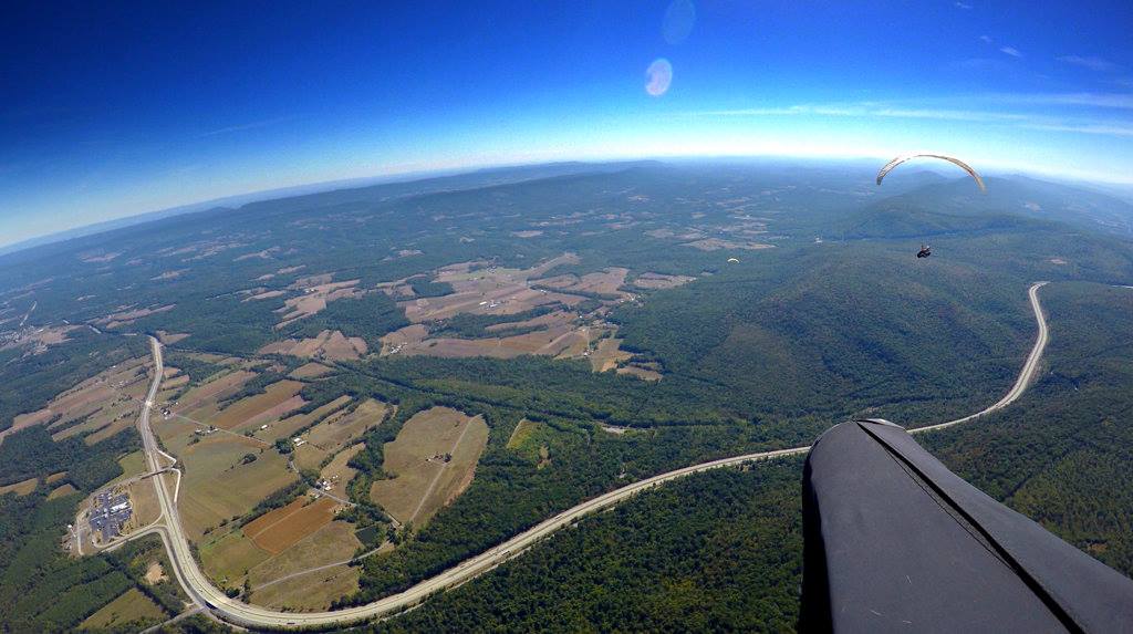 Day three was really fun. Buncha PGs at Bills. The overgrown slot was a bit of a challenge but most PGs launched OK and several got up and away. Four of us gaggled up and took a slow (L&V!) XC route first south along the ridge then west past Breezewood. About 30 km and just under 4 hours. TOL ~6k'. Beautiful L&V soaring conditions with moderate and abundant thermals.