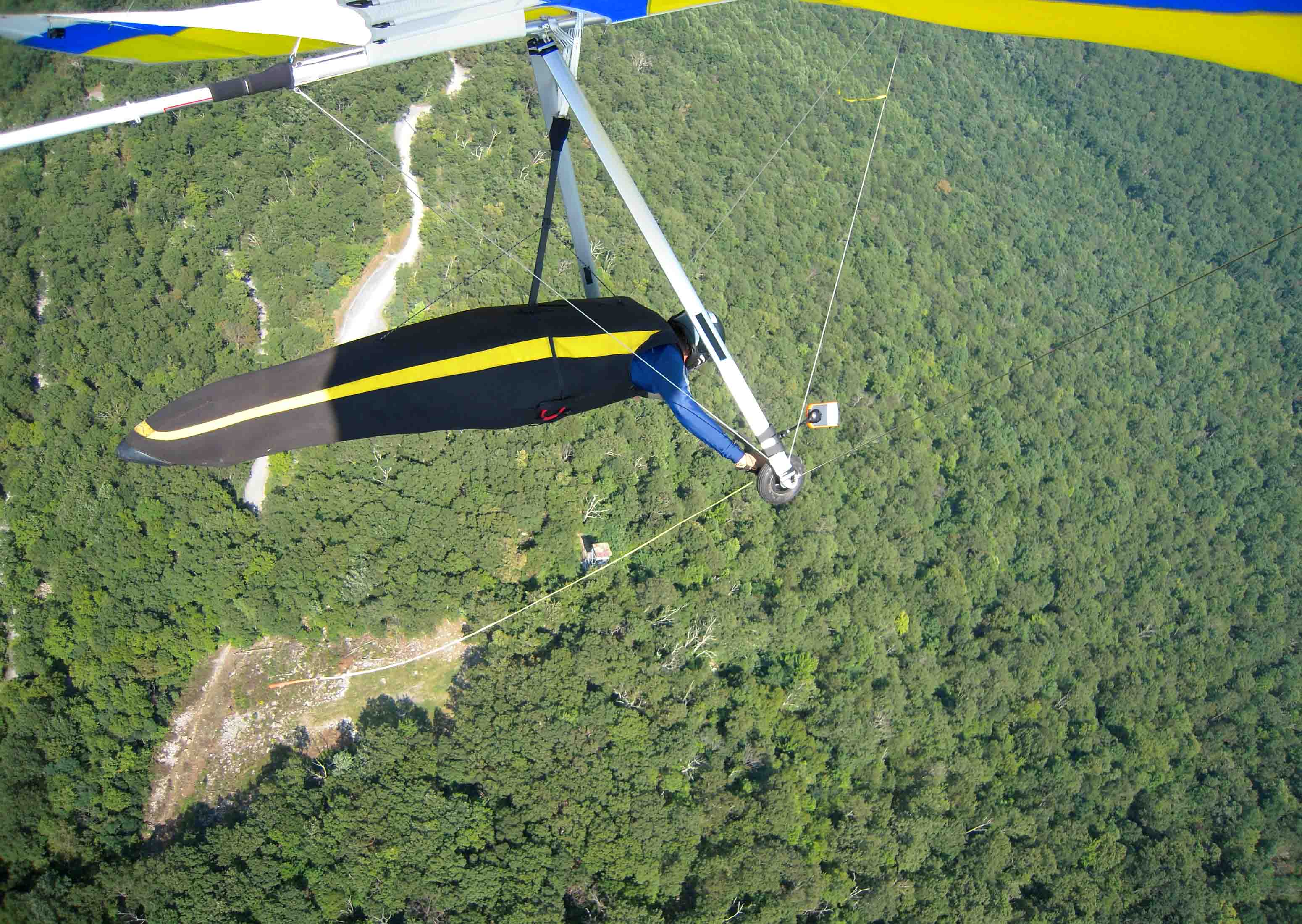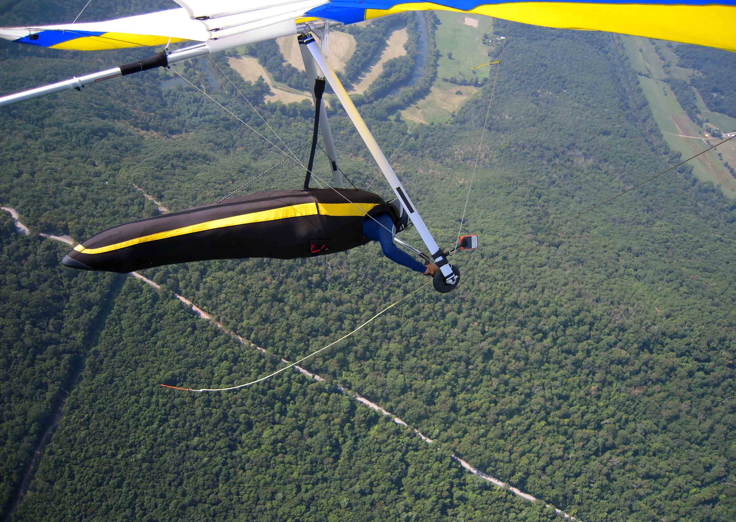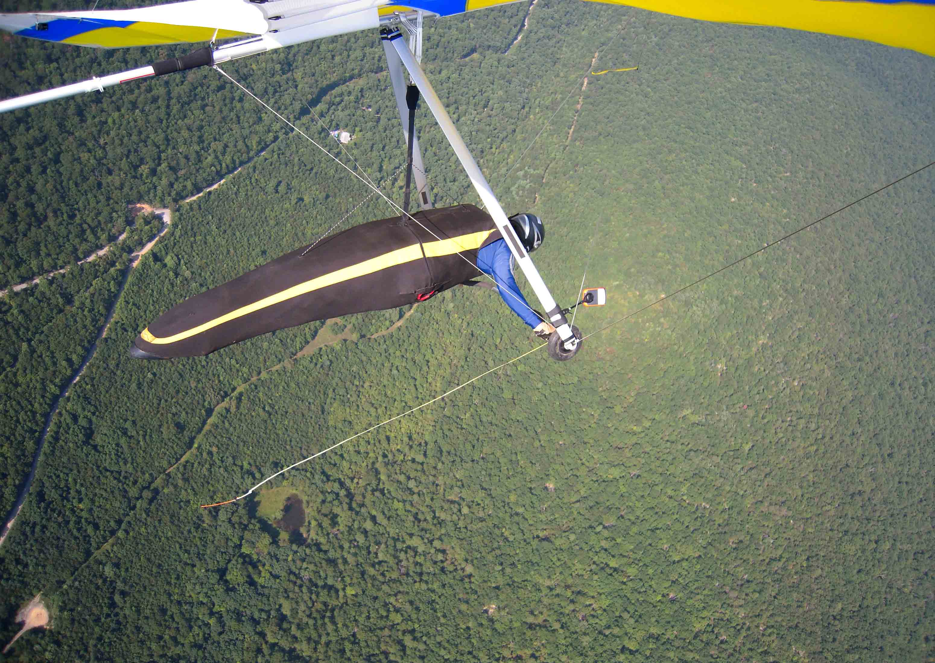 Tuesday’s forecasts indicated that the Pulpit would be blown-out so Rich and I decided to try our luck at Woodstock. Conditions at launch were less than ideal during the morning with a significant west cross but by 2:30 pm the tower weather station was indicating a consistent 290+ degree direction and soon after there were acceptable launch windows, albeit short lived. Given the variable air flow up the slot, Rich decided to wait for another day. I took off at 2:56 with help from Rich and Joe Shad (who came out to help, Thanks!) and landed at 4:30. During the first 40 min, I basically bounced between 200 and 500 ft above the ridge line while trying to stay in small pockets of lift that I’d lose after a 180 or 360 turn. After that, I was able to stay in the lift and managed to climb above 3,000 ft MSL several times. My climb rates were between 150 and 300 fpm. The first fairly decent climb took me to just over 3,800 ft. What was notable about this thermal was that there where 5 or 6 Ravens also climbing above me. Soon after reaching 3,000 ft, two of them dropped below me and started to circle. The guy in front inverted and then the second also followed. I guess they rolled over to get a better look at me or just to show off or both, whatever, I enjoyed seeing them. Unfortunately, none of the Ravens were in any of my photos. I left each of these climbs while in weak lift as I was concerned about penetrating back to the ridge. The first 4 images are from the initial climb above 3 K and the last 5 photos show (in 30 second intervals) my approach into John McAllister’s field.