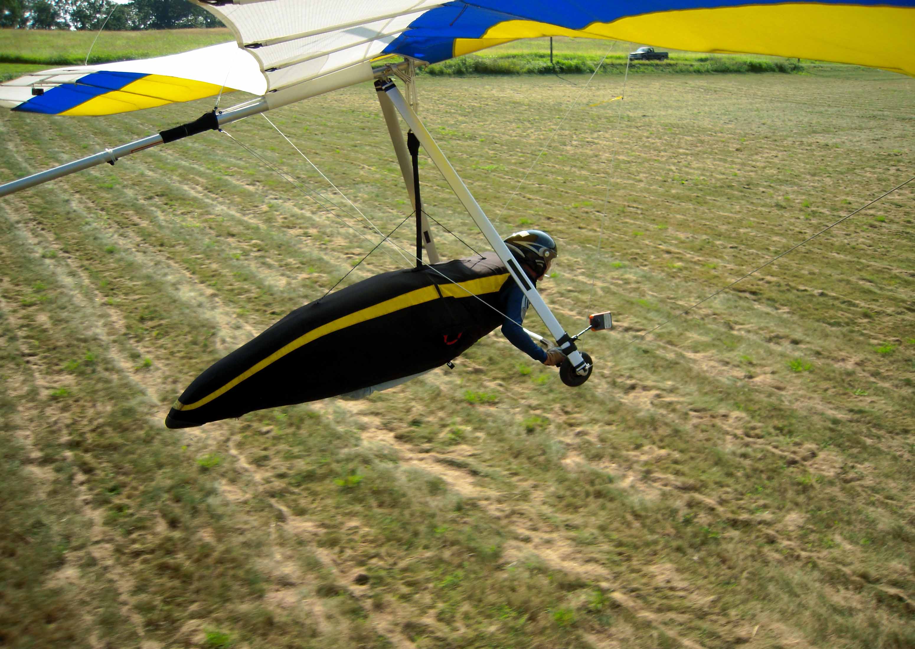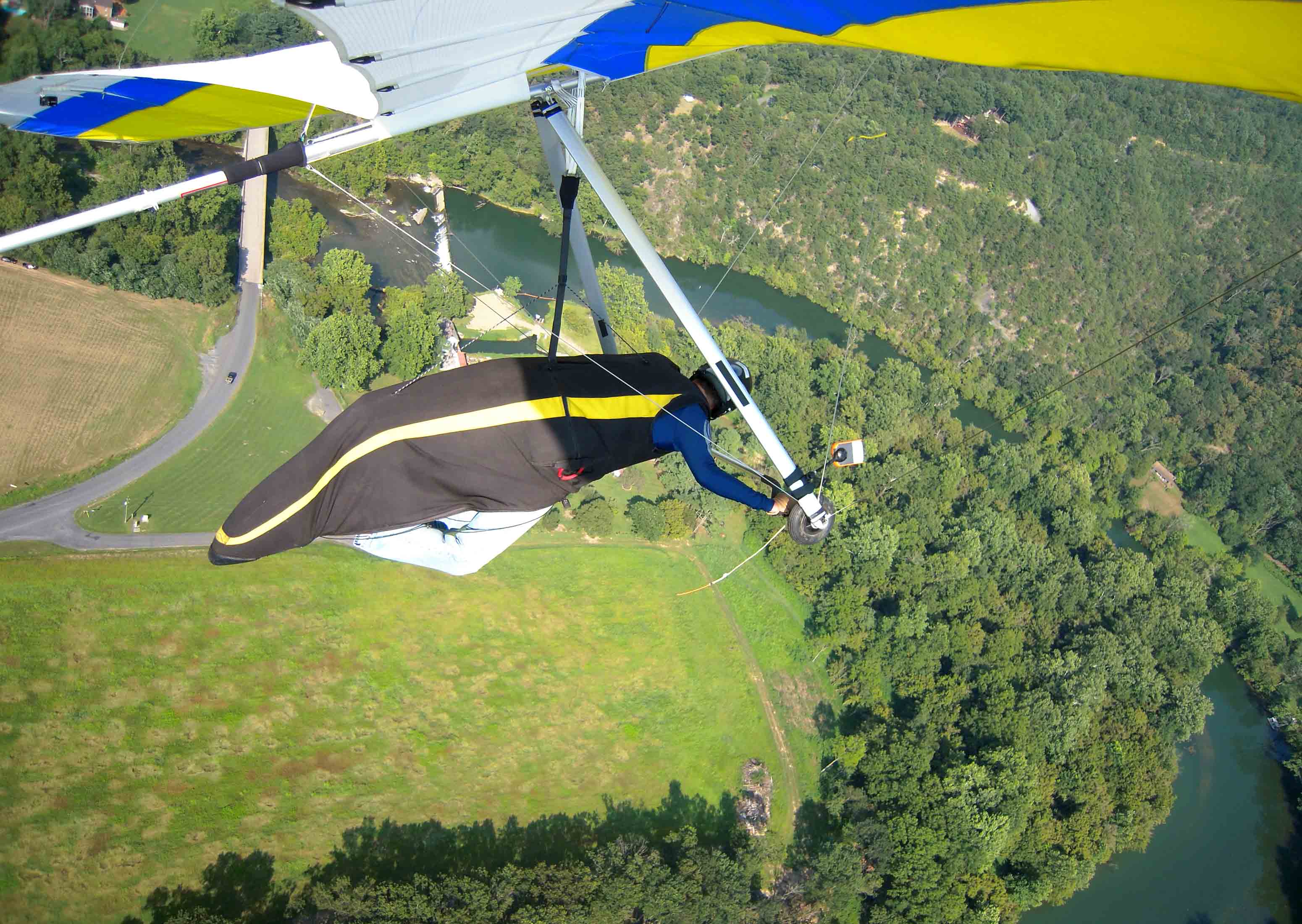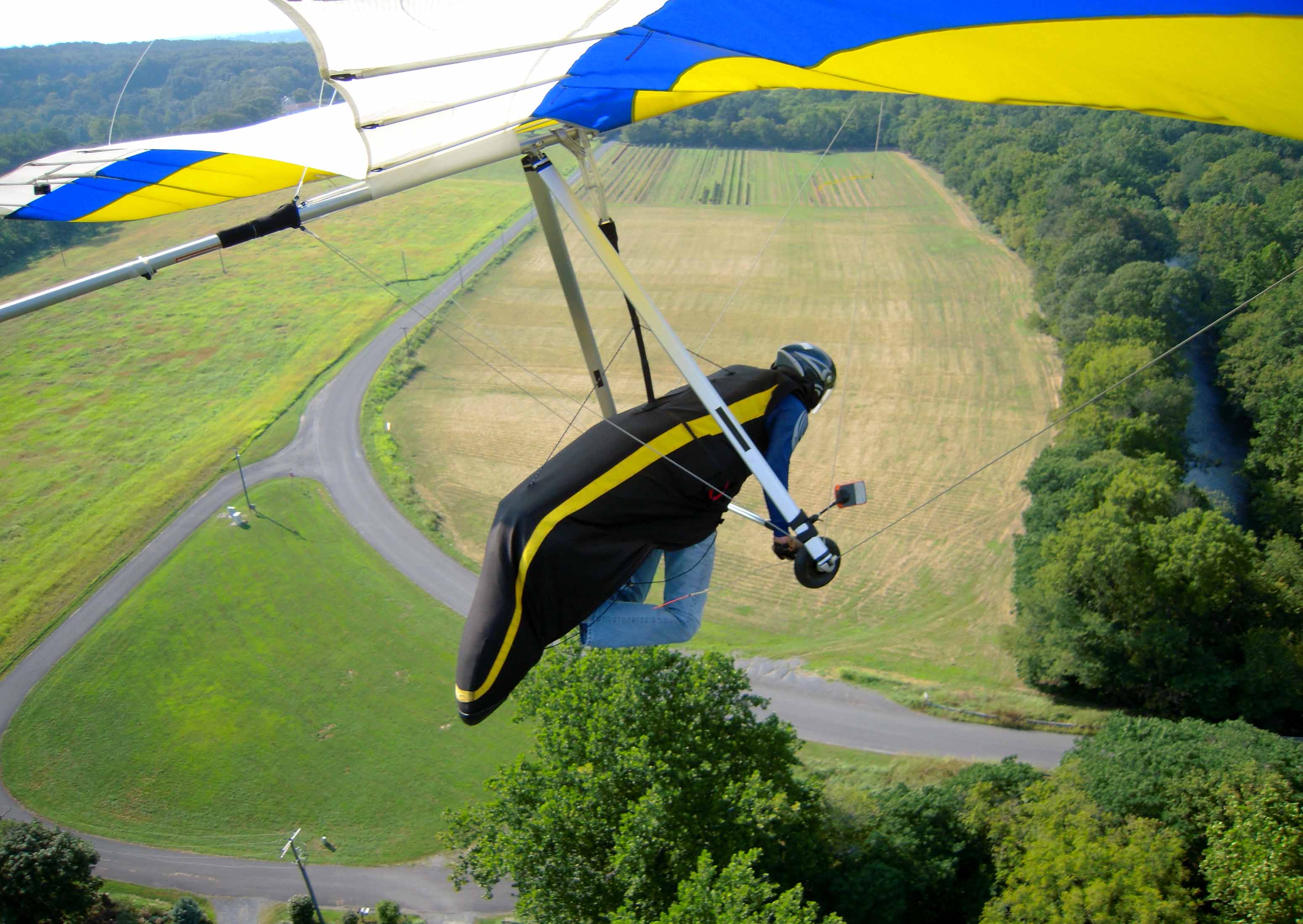 Tuesday’s forecasts indicated that the Pulpit would be blown-out so Rich and I decided to try our luck at Woodstock. Conditions at launch were less than ideal during the morning with a significant west cross but by 2:30 pm the tower weather station was indicating a consistent 290+ degree direction and soon after there were acceptable launch windows, albeit short lived. Given the variable air flow up the slot, Rich decided to wait for another day. I took off at 2:56 with help from Rich and Joe Shad (who came out to help, Thanks!) and landed at 4:30. During the first 40 min, I basically bounced between 200 and 500 ft above the ridge line while trying to stay in small pockets of lift that I’d lose after a 180 or 360 turn. After that, I was able to stay in the lift and managed to climb above 3,000 ft MSL several times. My climb rates were between 150 and 300 fpm. The first fairly decent climb took me to just over 3,800 ft. What was notable about this thermal was that there where 5 or 6 Ravens also climbing above me. Soon after reaching 3,000 ft, two of them dropped below me and started to circle. The guy in front inverted and then the second also followed. I guess they rolled over to get a better look at me or just to show off or both, whatever, I enjoyed seeing them. Unfortunately, none of the Ravens were in any of my photos. I left each of these climbs while in weak lift as I was concerned about penetrating back to the ridge. The first 4 images are from the initial climb above 3 K and the last 5 photos show (in 30 second intervals) my approach into John McAllister’s field.