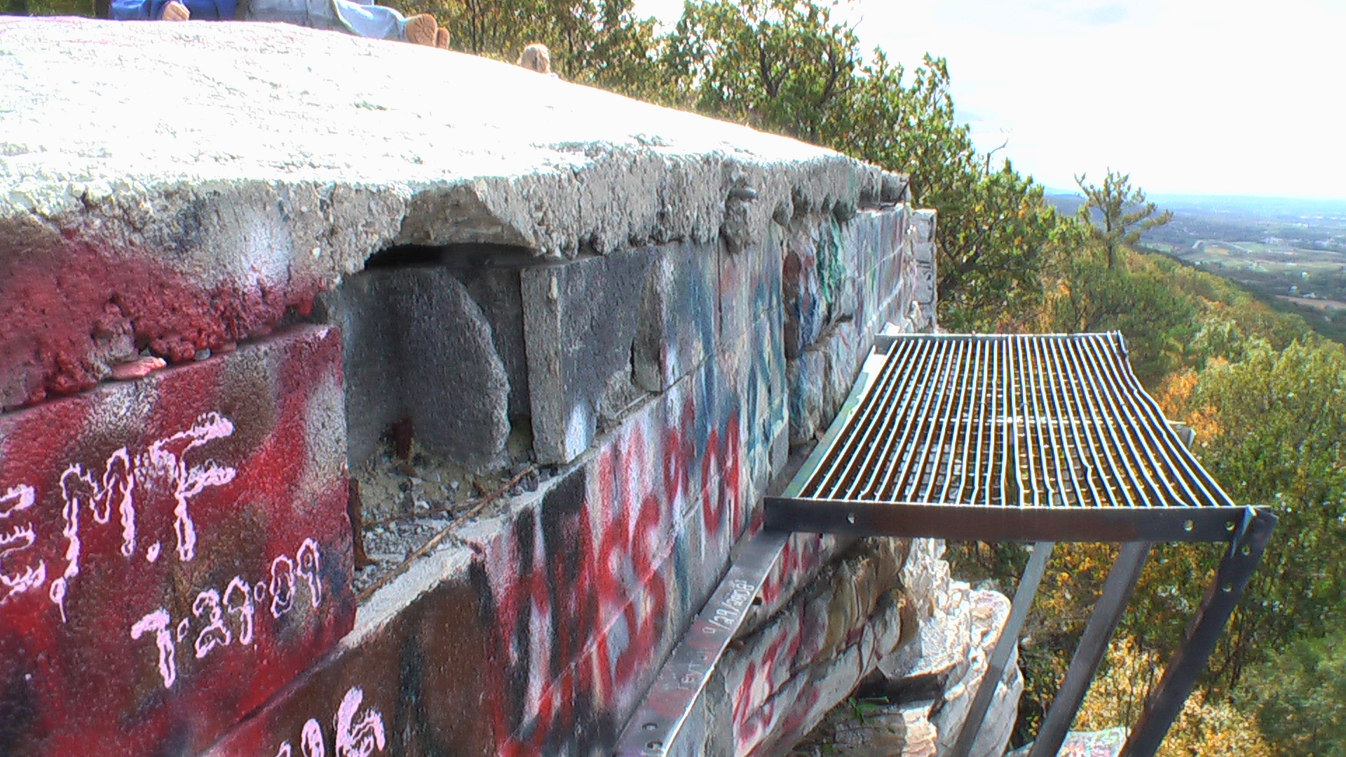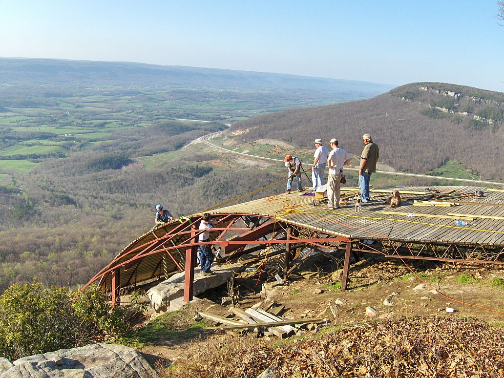 Another awesome coincidence! So we talked about demolishing the current cube and bringing it back down to the level of the stone pillars. There are 8 pillars, 4 sets of 2. He likes the idea of building the ramp using the middle 4 pillars as support and then setting posts for the back section of the ramp. We would then build stairs like the new ramp at the Pulpit or more of a ramp down like the old ramp at the Pulpit. He wants to see some pictures of the Pulpit ramps so I'll get him some. About then he mentioned that he was there to meet the county engineer to take a look at it. So a few minutes later Joe Kroboth, Director of Public Works showed up. Seriously, I can't believe the luck that we are all up here at once. He had seen the pictures and agrees that something needs to be done. He's entirely open to the idea of a new ramp but he does think of it as a new structure and not any kind of repair. Permitting, engineering.... But when I told him that I could present him with a professionally designed and drawn submittal, I just can't get it stamped by an engineer, he seemed to think it was no problem for him to get a county engineer to stamp it. Jim mentioned he could get the permit through his department so it wouldn't cost us, and Joe even mentioned they could waive the fees if there were any. Bottom line, they are on board. The one thing they did say was that there is an agreement in place between the county and the club that stipulates we are responsible for maintaining the site and would therefore bear any and all costs associated with the project. We'll still try to get the county to help out somehow but we're going to need lots of support to make this happen.