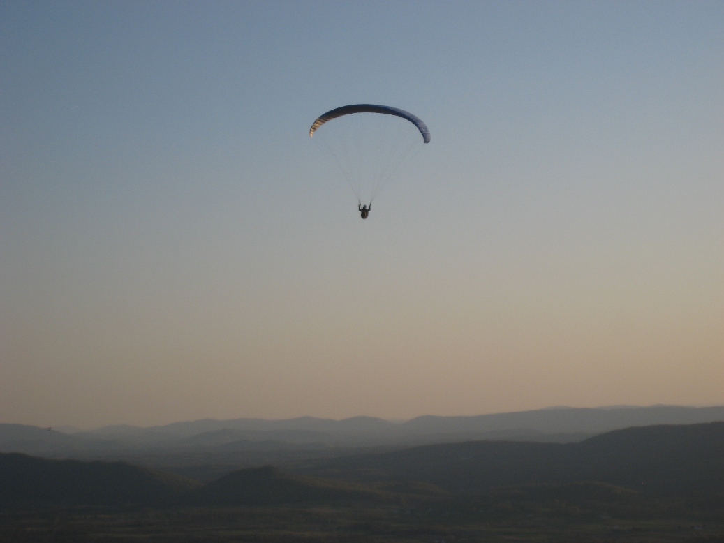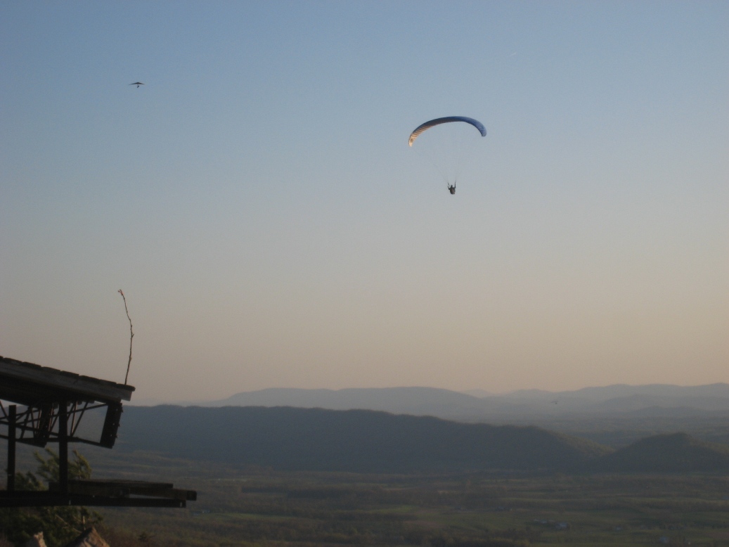 The early birds showed up at Woodstock starting around 9:45 under cobalt blue skies and straight in soarable conditions. The faithful included me, Bacil, Gary S, Steve K, and Bruce E. We got set up and decided to wait awhile for some heating because it had backed off a bit since we got there. As the wind continued to back off, Gary bagged it and opted to get some things done. Bruce finished getting set up and launched about 1:20 into a good cycle. We could see him through the trees and he found lift up North a little bit and got up over the ridge. Bacil went next with a very nice launch and hooked into some lift and was soon gaining as I went to get hooked in. Steve helped me down into the slot and once again there were no good cycles coming through. Actually no cycles at all. It was really light, just wafting in, but at least it was coming in. I stood there waiting for 10 minutes, just like Wed last week. Then Steve pointed out a turkey vulture cruising out front which then started to go up and began to turn. As Steve and I watched, he hooked into a nice thermal and was climbing fast. I decided to go for it. It was still just wafting in so I picked up, got level, and launched heading straight out to the vulture. I found what he was in and got up over the ridge and I could see Bacil and Bruce already a couple miles North of launch. I stuck with that thermal up to 750' over the ridge and found a little bit more lift here and there but not much that was very organized. I soon found myself at launch height and tried to tuck it in to the non-existent ridge lift. I tried the SW facing bowl on the first North finger, no dice. So I went out to land and was staging over the corner of the field at 400' AGL when I got a couple beeps. I decided to turn in it since I was right where I needed to be to land and for the next 10 turns I was basically averaging zero sink. Finally it started to turn on and I gained a couple hundred feet. About then Bruce had come back and was low, saw me climbing and came over to join me a few hundred feet below. Unfortunately, the ladder was coming up right underneath me so there wasn't much for him to work with. But I managed to climb 800' in that thermal back up to 100' over launch. My first genuine low save! But the fun didn't last long, I searched for more but didn't find it and had to go land. Had a nice landing after 30 minutes in the air. Bruce had just landed before me after getting an hour and 2,000' over and then we saw Steve launch. He found a few burbles and got an extendo and had a really nice landing. A PG pilot named Ron launched and got up in a few nice ones and then came out to join us in the LZ and then joined the club. Welcome! I hung out in the LZ while Bacil retrieved his glider after landing out near Tom's Brook and then came to give me a lift up the mounatin. Thank you sir! I hear the Pulpit was great! Anyone up for some more there tomorrow? It's lookin pretty good!!!