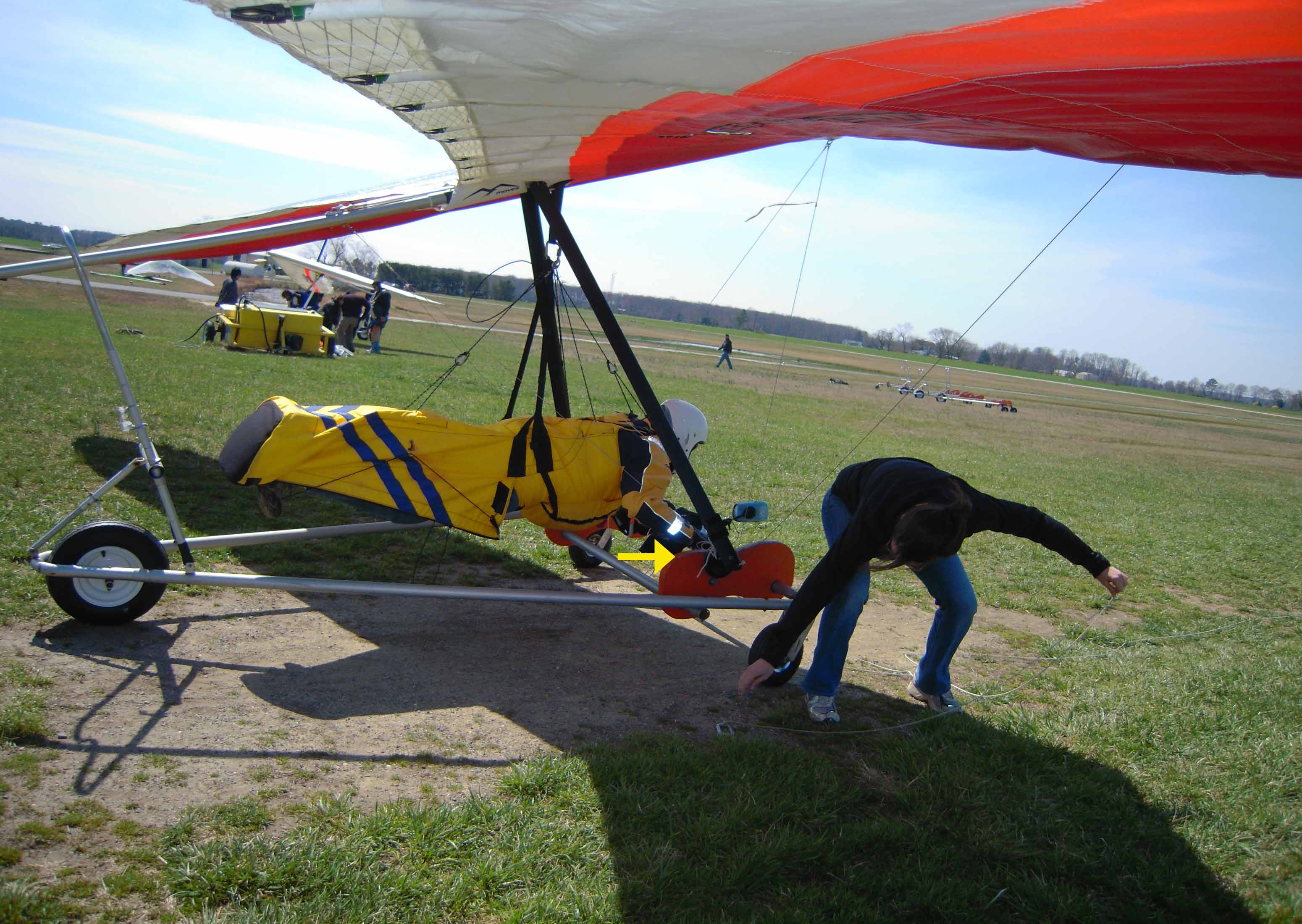 Took one tow at Ridgely on Saturday that resulted in an extended sled-ride. While going through the photos of the flight, I noticed that my VG line had become a “loose end” soon after Adam started his takeoff roll on the tug (see photos). The bouncing/vibration of the cart and head-wind just after 10-15 ft of roll was enough to toss the line. Fortunately, it didn’t snag and I don’t want to think about what would have happen if it did. From now on, wedging a folded VG line between the upright and flying wire is not an option. I’m considering using a rubber band to secure the line to the upright but if there is a better idea please let us know.