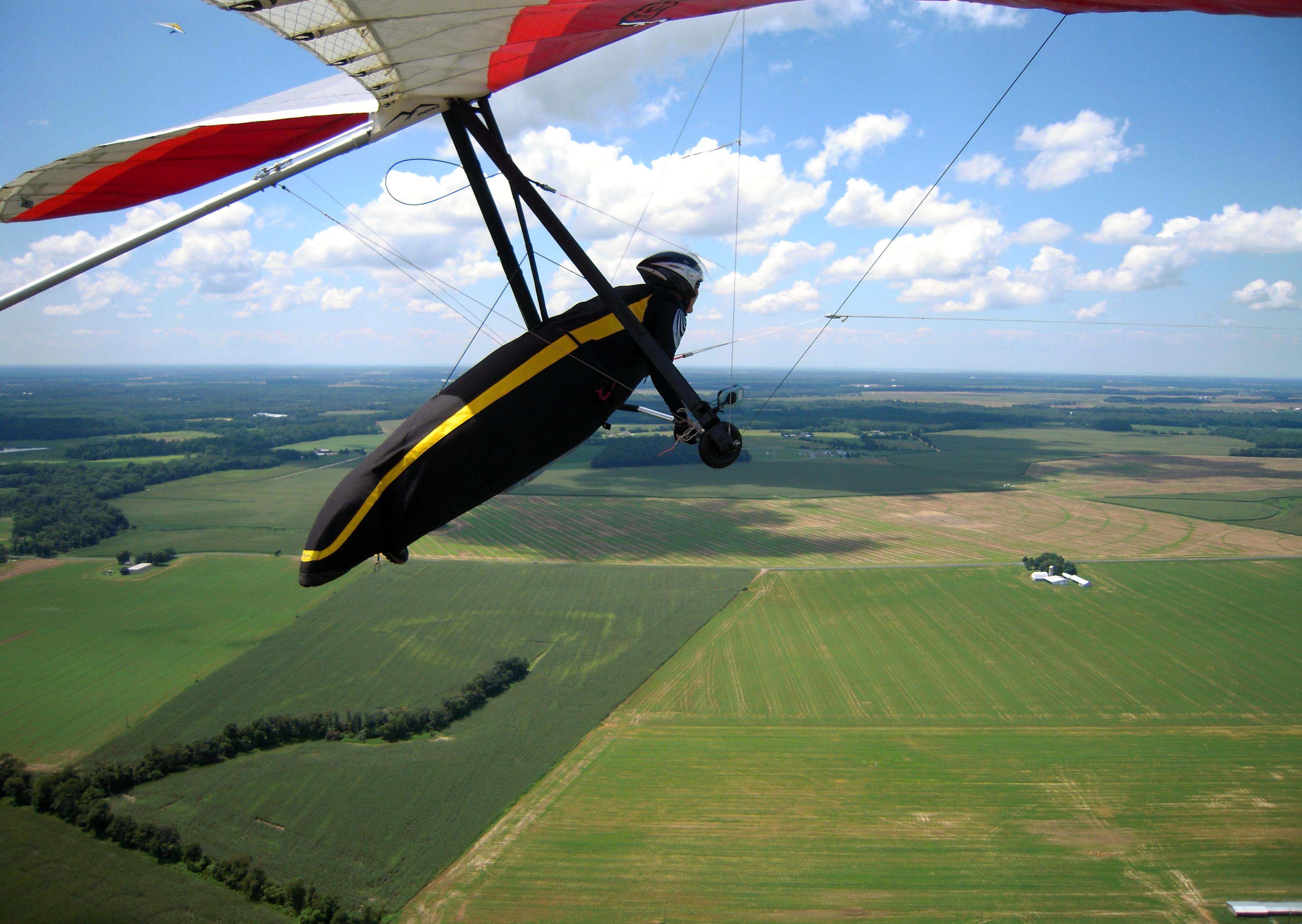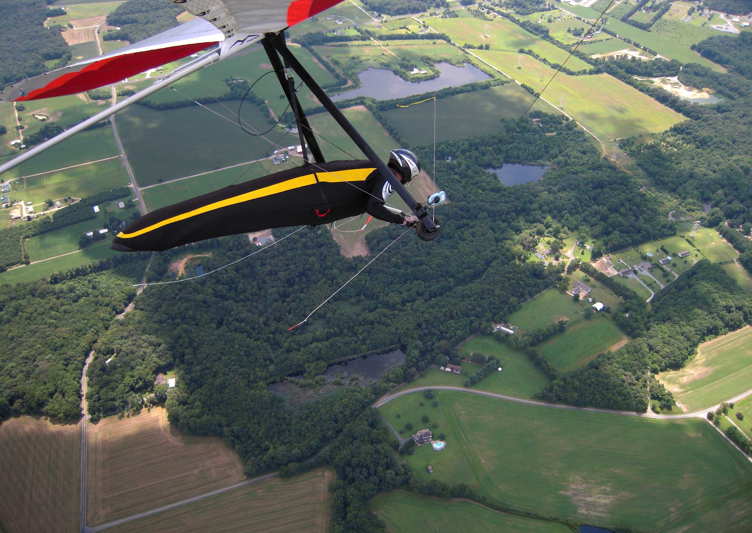 It was a good day at Ridgely. The morning forecasts were accurate and by 12:30 the clouds looked great. Jim Rooney towed me up at 1:15 and shortly after leaving the air park Jim entered a thermal that left me struggling to climb at his rate but that quickly reversed when he exited the thermal. As I watched Jim sink out, I was now trying to dive down to his level while listening to my vario scream. The weak link snapped within seconds leaving me with two options: return to the field and try again or search for the thermal that triggered the break. As I turned back to the field, I saw John Middleton circling close to where I lost Jim. Without John’s help, I would have most likely been on the ground in minutes. After the first climb that took me above 4 K MSL just south of the field, I headed south passing just east of Denton. Flying fast through the down air and slowing up for zero sink, I was able to find three additional thermals that each took me above 3K MSL. After leaving the last thermal near Federalsberg MD, I flew into a large area of down air that drove me down to an altitude that triggered my mental alarm of “find a LZ NOW” so I picked out a recently harvested field next to rt 404. I got back to Ridgely just in time to watch Jim M make a text book no wind landing flying his LightSpeed. It was one of the softest returns to earth that I’ve witnessed. Here are some photos of my tow and 12 mile flight to Federalsberg. Ward