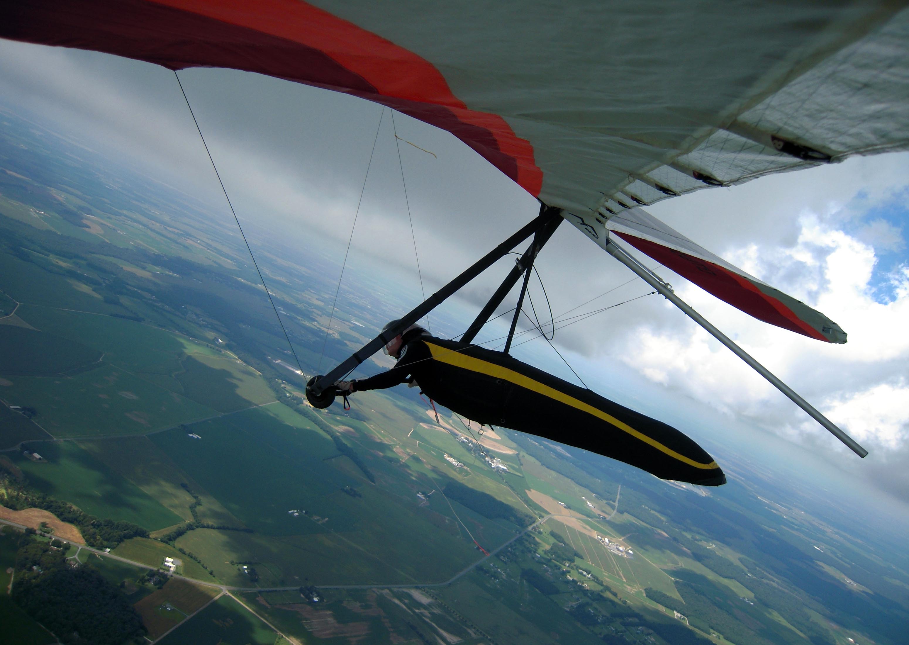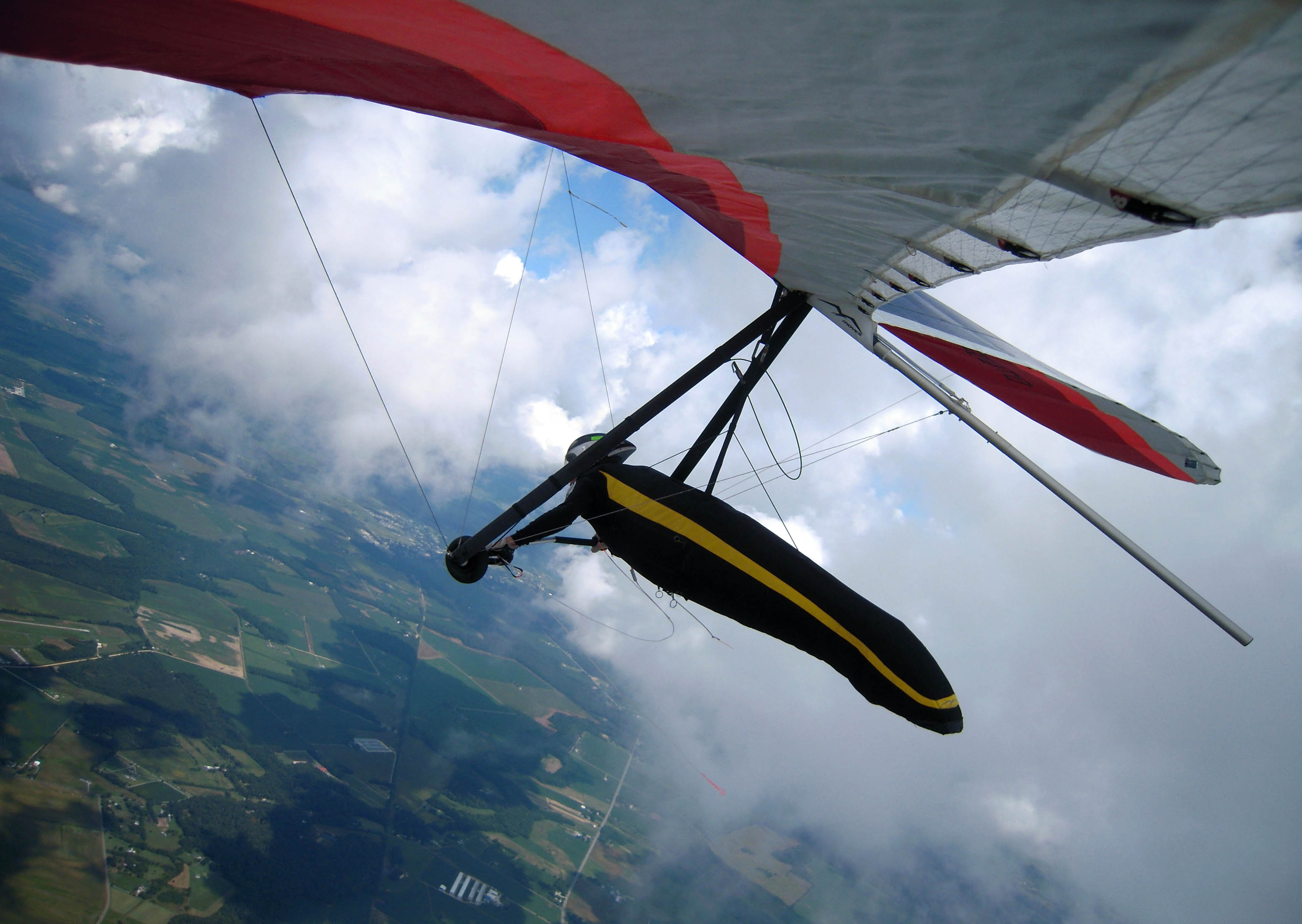 Managed to pull off yet another stupid flying stunt yesterday and the more I consider what I did, the more I realize just how selfish and dangerous it was. I’m showing it for its heuristic value. My hope is that these images will help others avoid the seductive trap of climbing above cloud base. I believe it’s a given that most of us like lift and staying in it, well that’s even better. The problem is that lift can transition from a good thing to nightmarish bad faster than most of us can anticipate. Just ask any one who flies a glider with poor penetration performance how lonely it gets above a ridge when the lift ramps up due to increase in wind speed. Yesterday, I was reminded of how thermal lift at cloud base can suck you up into its white room before your mind can transition from the “lift is good” mantra to the “I want my Mommy” panic mode! Rooney towed me up after the Highland Challenge Pilots were in the air at around 2:15. After releasing, I found a large area of essentially zero sink south of the airpark that gradually became 100 to 200 fpm lift to cloud base. The next three thermals were essentially the same, with the lift increasing as I climbed higher. The base of the last thermal was defined near its edges at ~4,500 ft msl but appeared to be concave in shape with the cloud level higher in it’s central region, and that’s were the strongest lift was found along with me – enjoying what was now 400 to 500 fpm consistent lift. Had I paid attention to the clouds near the one that I was under, their rapid vertical development should have raised some red flags as to what was happening above me. Before I realized the extent of the danger, my visibility was reduced to feet. The lift was stronger with essentially no perceived lateral turbulence. I tried to counter the lift by flying with level wings (straight) and as fast as I could which made little or not difference in what my vario was telling me and at times I felt as if I had flown directly into stronger lift with my nose pitching up even with the control bar stuffed. When I exited/spiraled out of the side of the cloud, the ground was spinning faster than a merry-go-round. My first reaction was basically of disbelief. How could I be in a spiral when my wings were level with no sensation of turning? Had I remembered what every flying text harps on – no visual references with no instruments translates to no clue as to what your flying orientation is, I may have avoided a major fear induced adrenalin rush. I consider myself lucky to have escaped a bad situation and foolish for ignoring safety rules. My highest climb of the day (most likely in the cloud) was recorded at 5,708 ft with the altimeter set at 65 ft before takeoff. Here are some photos of the event starting at cloud base and ending with my heading back to Highland. Ward