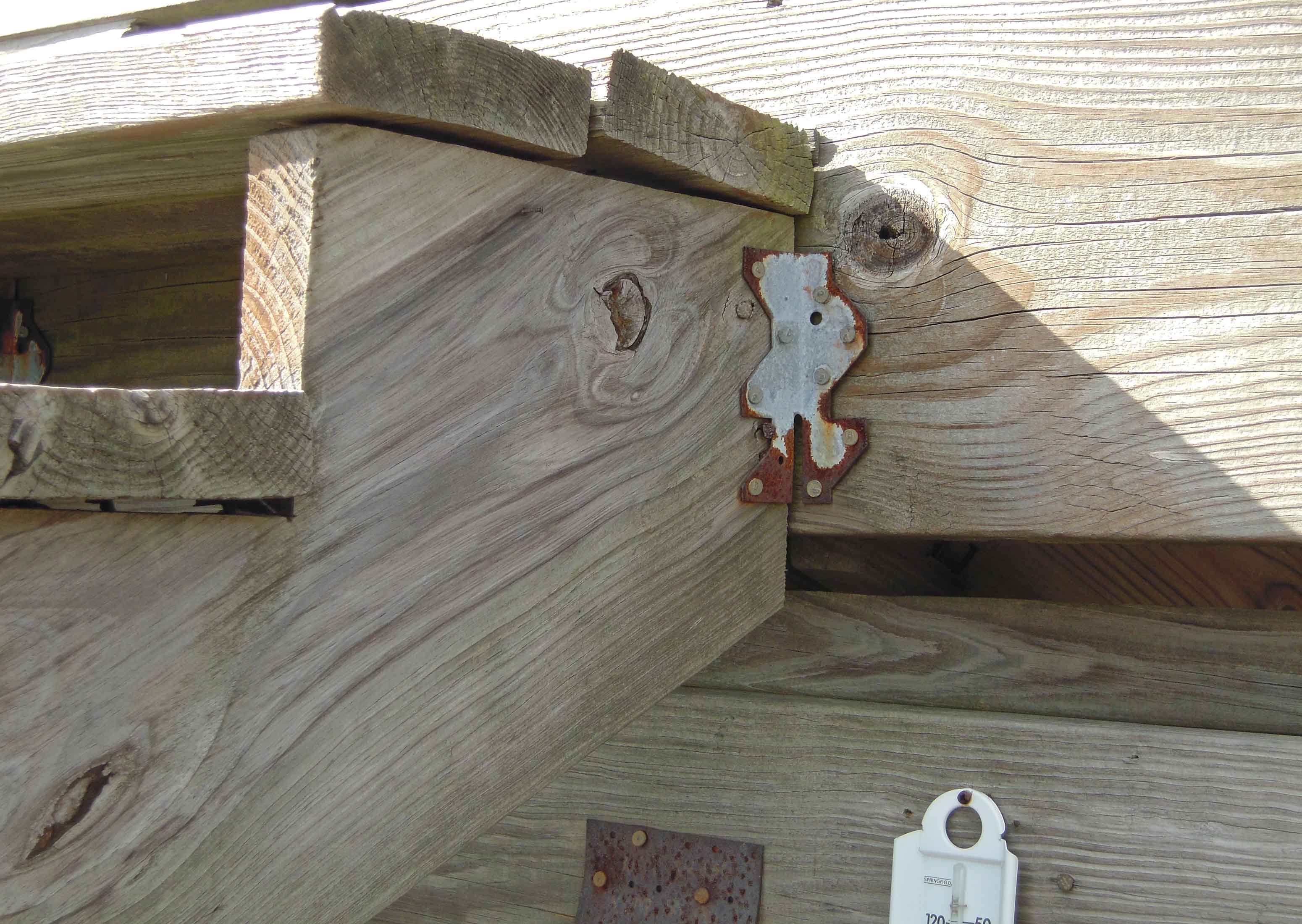 North Ramp: Considering its 19th birthday was 3 days ago, its in remarkable shape. The foundation is solid with no detectable significant issues. While under the ramp, the wind was howling at times (at least 50 plus mph) and there was no detectable vibrations or swaying. Although some of the supports and beams had minor splits or cracks, there are no signs of dry rot and the metal plates that secure its joints are in good shape albeit rusted. The stairs are weathered but also in good structural condition. However, some of the stair planks need refastening with nails or screws. “Nail pops” on the stairs and on the upper surface planks of the launch platform are the only issues that I could find and just one launch plank needs a new set of screws or nails (the board closest to the stairs).