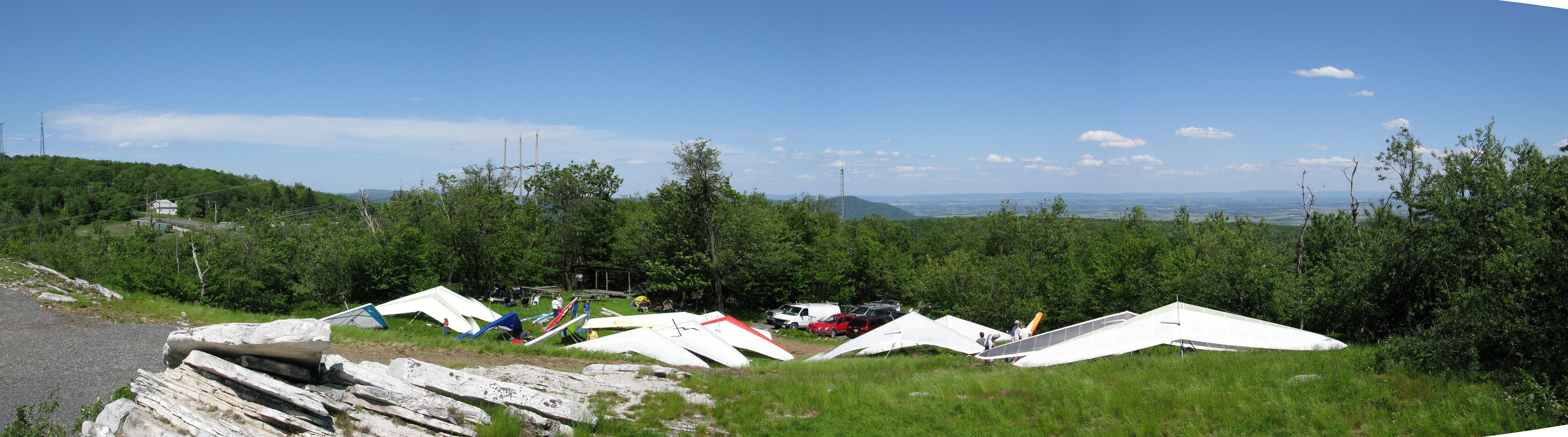 Fantastic day Saturday. I believe we had 24 HG pilots and 1 PG pilot launch in total. I'm not even gonna try to name names. If you weren't there, you shoulda been. It was way strong on launch during the afternoon. I waited until sometime around 5:30 and then launched. I flew until I was tired and didn't want to miss a ride back up top. Airtime was 1:45. Of course, Rt. 30 was closed for an accident, could've flown another half hour. But that's quite alright, my tank is full. Hats off the both Bacil and Janni, for calling a perfect forecast and pushing through an awesome new launch pad, respectively. I didn't get to try out the new launch, North cross when I was up, but I will soon. I'd say the ad-hoc fly-in was a great success. Well done gentlemen. No video this time, just a couple panoramas. See ya next time.