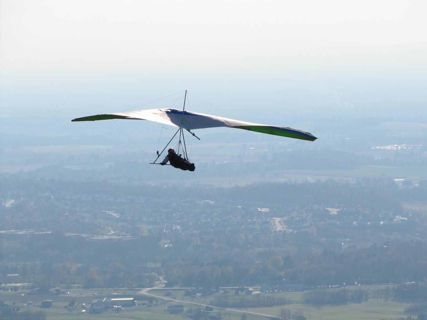 Today, we made the haul up to Hallam Hill, a north-facing training hill near York PA. Judy got her first flights with her new wing and Sallie was able to progress from yesterday's reverse inflations to a couple of reverse launches - but at the price of a sprained ankle. Brian got two flights on the Sport 2 and thinks he will make it his new number one glider, retiring another one from his fleet.