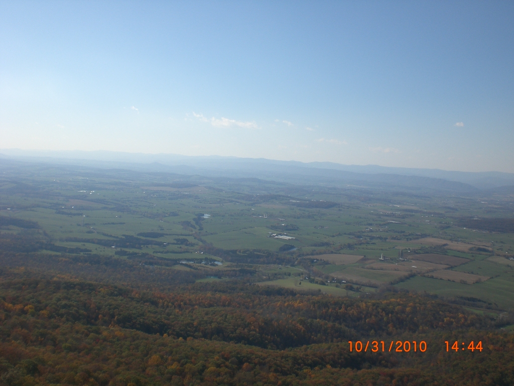 Looking south from the LZ. Grubbs and Lairds Knobs plainly visible, Massanutten Peak a small bump in the distance 11 miles away.