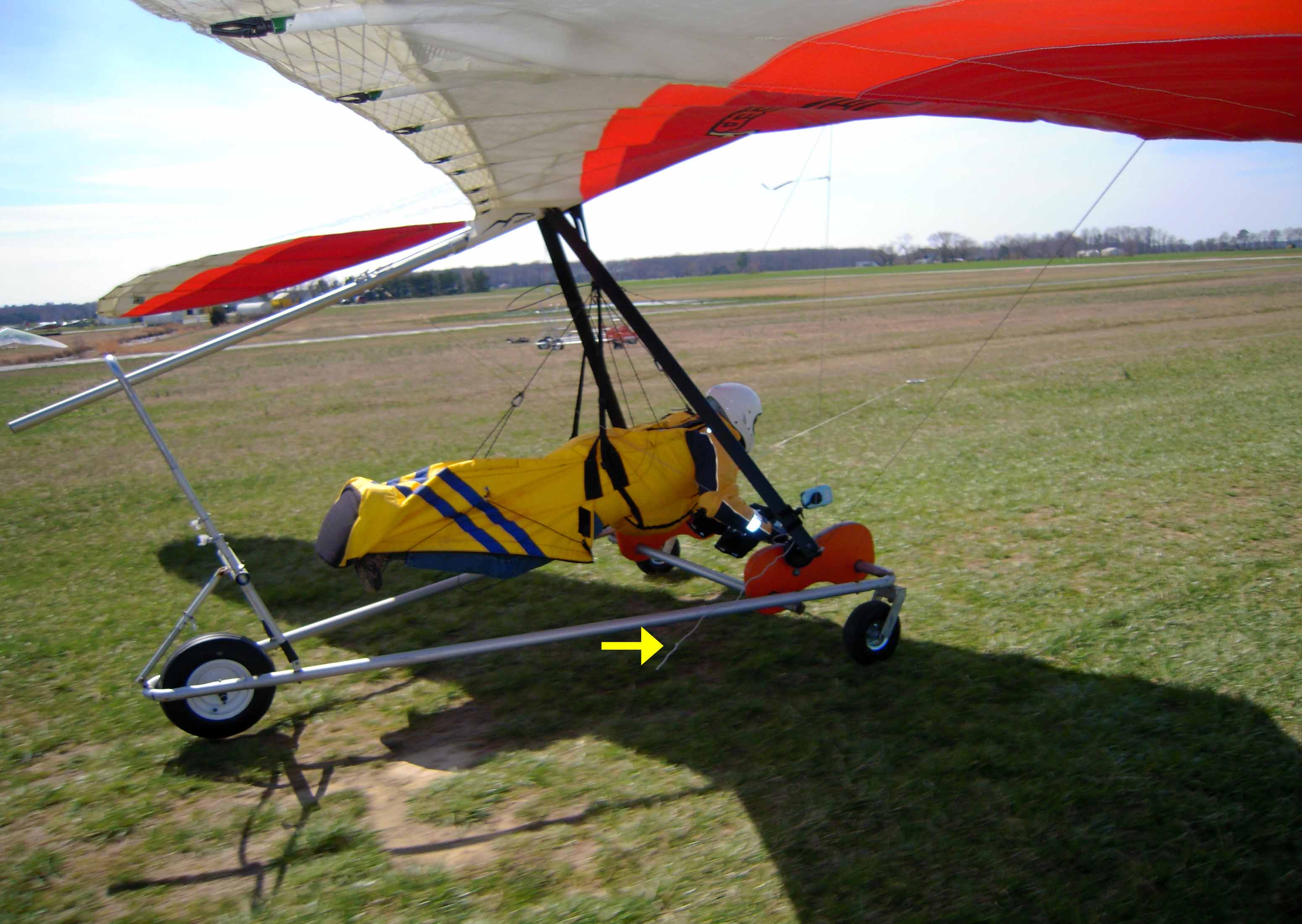 Took one tow at Ridgely on Saturday that resulted in an extended sled-ride. While going through the photos of the flight, I noticed that my VG line had become a “loose end” soon after Adam started his takeoff roll on the tug (see photos). The bouncing/vibration of the cart and head-wind just after 10-15 ft of roll was enough to toss the line. Fortunately, it didn’t snag and I don’t want to think about what would have happen if it did. From now on, wedging a folded VG line between the upright and flying wire is not an option. I’m considering using a rubber band to secure the line to the upright but if there is a better idea please let us know.