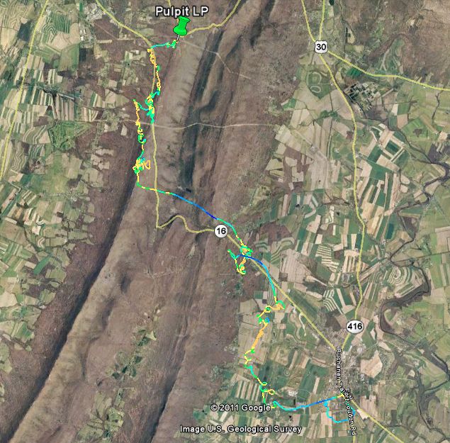 It was N cross 90 degrees all day with 5-15 mph gusty cycles straight in that were hard to launch in and tough to get up in. I had some aborted launches. Not any easy day. I managed to find lift by following Rt. 16 then got high over the antennas and decided I could make the gap at the very least. I made it over pretty easily and found some lift just beyond the gap. However, I made a mistake and left the lift line to fly over Mercersburg instead of just going South with the wind and sunk out. I think beer was on my mind. When I landed I could see the cloud street setup on the line I was on. Next time!