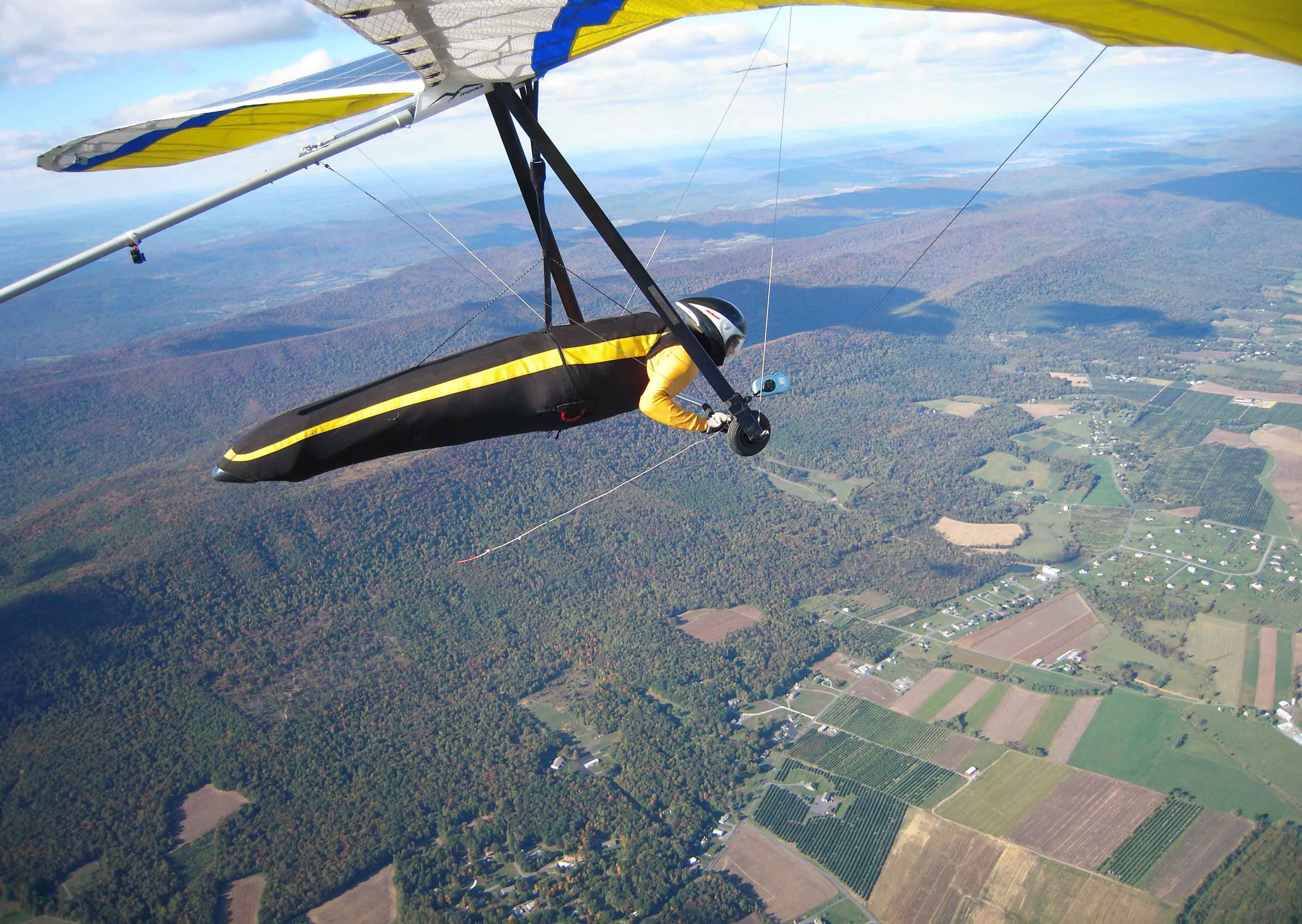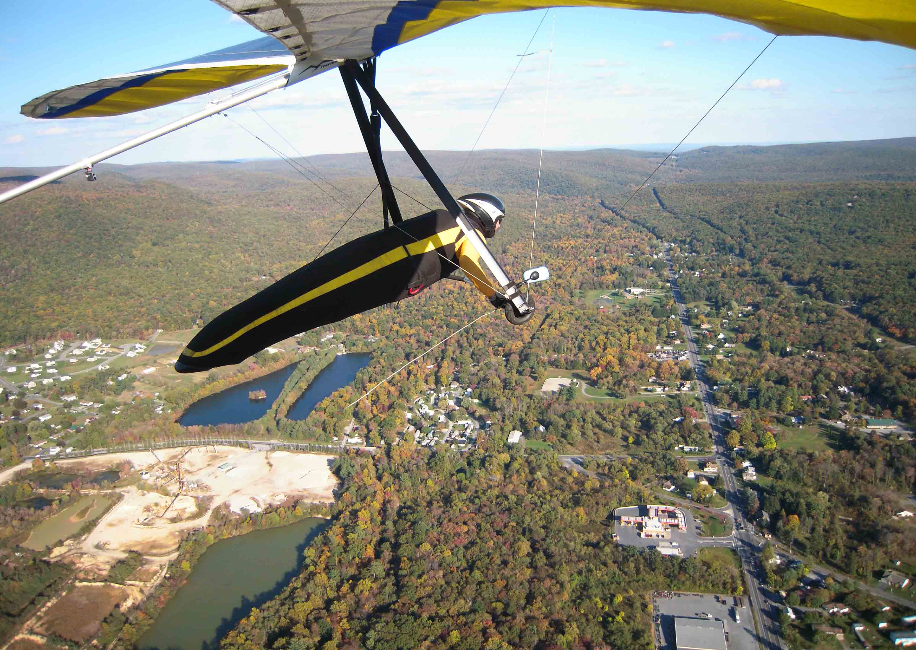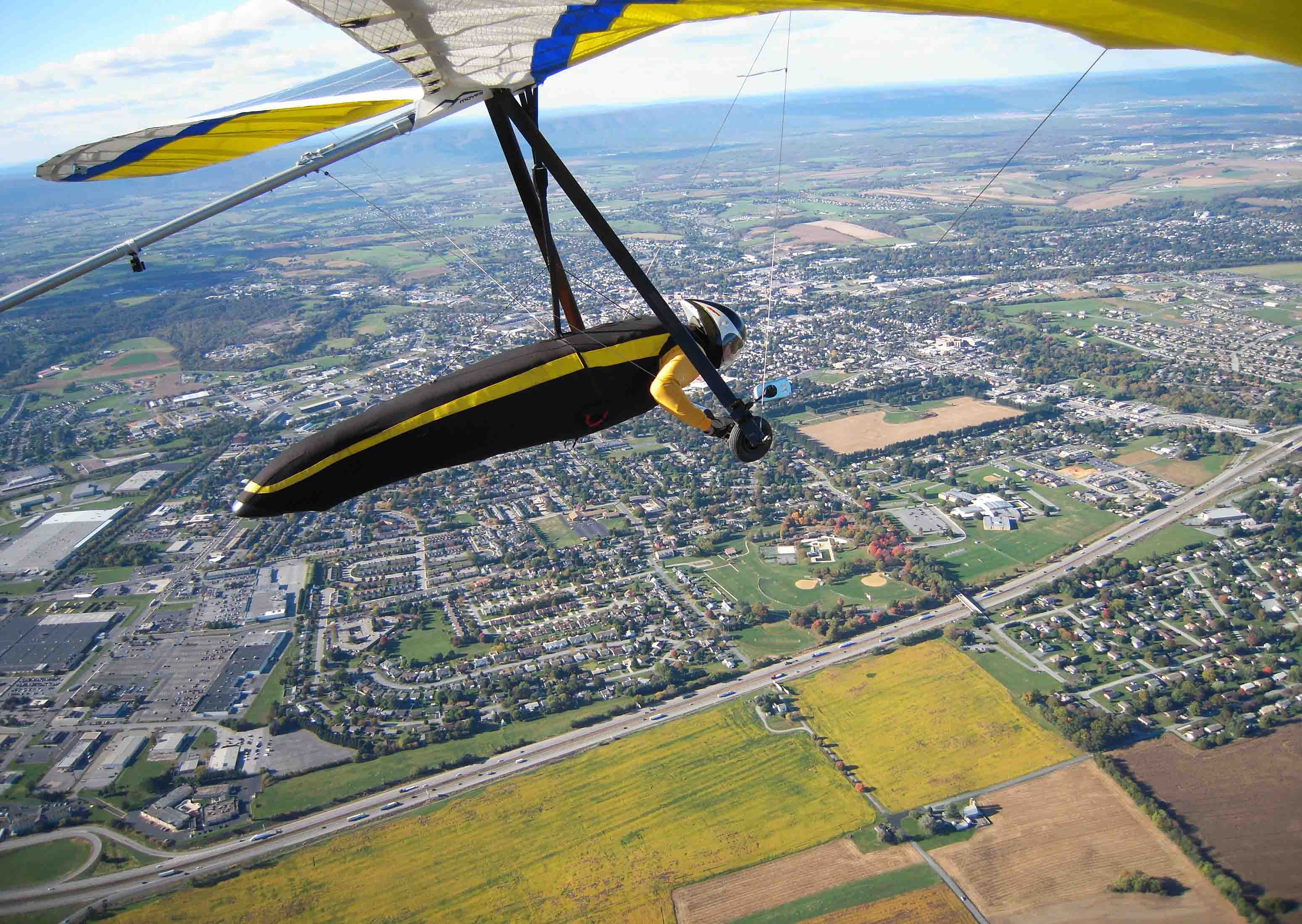 It was good! Five of us flew, three western PA pilots (Dave Gills, Randy Grove and Chris Bruno) plus Walt. Once the valley heated up, we had blown out conditions but by 2pm the 20 to 25mph wind dropped back to 15 to 20. Ten minutes into my flight, I found a thermal just south of launch that took me to 6,396ft msl and over the back. Flying down wind (along the southern edge of Rt 30) I spent the first third of the cross-valley flight above 4K but by the time I reached the south end of Chambersburg the thermals were not taking me any higher than 3K. As you can see from the photos, when I reached the edge of the Michaux Forest I was averaging ~1.5 to 2K, working what was most likely small updrafts coming off of Rt 30 and flanking buildings. From there, I headed south along the ridge and landed ~1.5miles southeast of Fayetteville (flight time was just under 2 hrs and straight line distance from launch, 23.3 miles). The following 3 sets of 5 images focus on the first thermal, crossing the valley and low thermal flying.