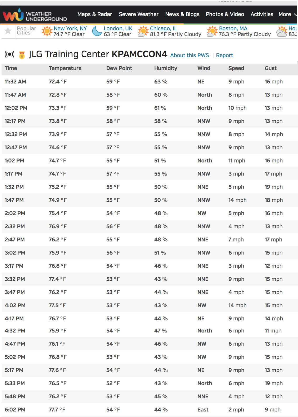Here’s an interesting comparison of yesterday’s conditions at the Pulpit vs. the Hagerstown Regional Airport. The JLG Training Center weather station is 1.7 miles from launch and positioned ~0.5 miles south of McConnellsburg (almost directly out in front of launch). The Hagerstown airport is 19 miles SE of launch. The info about the JLG station states that its elevation is 945 ft which puts it at ~50 ft above the ground (downtown McConnellsburg is listed at 892 ft). Don't know the elevation of the Hagerstown site but its most likely on top of the control tower. The screen shots show yesterday afternoon real time readings, hourly readings from the airport and 15 minute intervals from the training center.