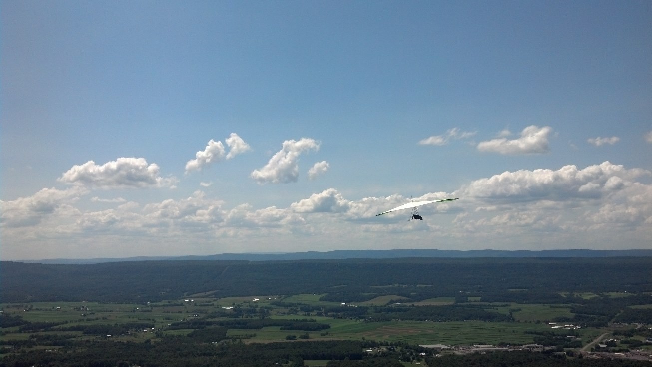 Arrived at the Pulpit around 10:30A to find a glider propped up on its control frame and nobody around. Conditions were already soarable and pretty strong, as was indicated by the weather station all morning. On the horizon was a bank of good looking cumulus clouds headed our way. Started setting up and Charley and Mark showed up. They had dropped off Mark's car at the main LZ. Charley brought out his new Moyes Gecko glider with 2 hours of airtime on it. Sweet looking glider. Nick Brown showed up to just help out w/ launches. Thanks Nick! Launched from the new ramp into moderate conditions and got up immediately. However couldn't find a good climb and spent a good half hour at 300'- over to down on the deck. By this time Charley had launched and was soaring to the north of launch. Clouds had reached us by then but we couldn't find any good climbs yet. I got on the deck again and headed down to Rt. 16 below the ridge. Luckily found some lift down there and got back up to a few hundred over. By this time Mark launched and headed my way. Mark and I found some lift and we climbed up, while Charley was above us climbing in the same thermal. I climbed to 3100' MSL and headed north towards the goal of Shippensburg Airport. Charley headed north from 4K'+ MSL as well. By the time I got to where the ridge bends from W facing to WNW facing I was below the ridge. Luckily again I found some lift to give me the much needed clearance from the ridgetop. Charley and I made it up to Cowan's Gap Lake and we both found good thermals to go OTB. We climbed directly over the lake, giving the locals a good show. I got to 4600'+ MSL, while Charley got to 5K'+ MSL (cloudbase). We dove onto the large flank of Kittatinny Mountain and headed north towards Fannettsburg. Charley stayed at cloudbase and I sank down to just a few hundred over. Chose to dive OTB of Kittatinny to the Horse Valley, where nice landing fields beckoned. The fields in Path Valley in front of Kittatinny were far out and not very friendly (full of crops). Found some lift over the valley and clung to it. Dug myself out of the hole and gained up to 4100'+ MSL, enabling me to dive into the wide Cumberland Valley NW of Chambersburg. By this time I was worn out from the active flight, so I didn't try too hard to stay up. Plus nothing was going on but gentle sink, so I enjoyed the glide and searched for a nice place to land. Found a nice grass strip next to a soybean field and came down in smooth air. Another late flare but ran it out. As I was breaking down next to Portico Road just south of the Letterkenny Army Depot a nice gentleman drove up to chat. Clarence Dice ended up giving me and Charley, who landed 2 miles from where I landed, body rides back up to launch. We gave Clarence a tour of the launch as John Middleton was going in to land. Eric Kriner had an excellent XC flight and landed near Green Village, NE of Chambersburg. Mark as described had a really fun flight. I followed Charley to his Tiki Bar where we enjoyed pizza and libations celebrating a helluva maiden flight on his new Gecko glider. Too much fun