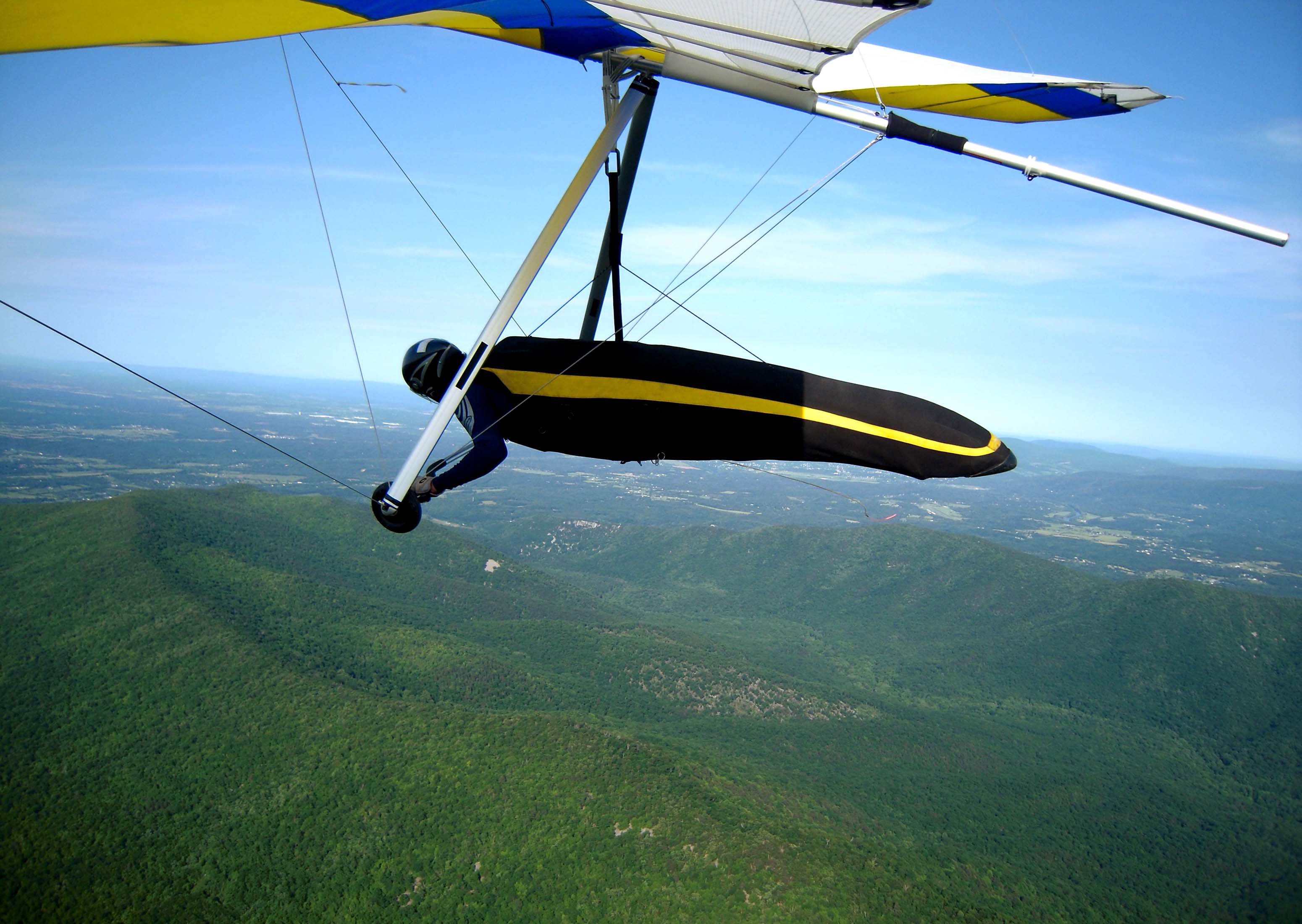 Since the road is closed it is less convenient to land out front. Ward and I had a plan to land out at the Front Royal Airport. Earlier flights by Joe, Gary, John and Walt were not producing the altitudes (4K MSL) that would make it an easy flight. Fortuitously, flying later proved to be a good option. Ward launched first sometime after 4PM (thank you Gary!). I launched last and we both got up easily and made our way to the north. Solid ridge lift with intermittent thermals made it a pleasant trip. Ward and I flew cooperatively marking lift for each other. I have some good air-to-air footage. We staged by the point and I got a couple good climbs and could have drifted back and climbed even more. I went back out front of the ridge as Ward appeared to be heading back to the main LZ. I did not want to get separated so I followed. Unfortunately, I spotted a finely feathered Bald Eagle below me and my selfishness took over. I could not resist to fly in close and climb in the best thermal of the day. I floated with this colleague back over the valley to 5.3 K MSL and easily had the airport.