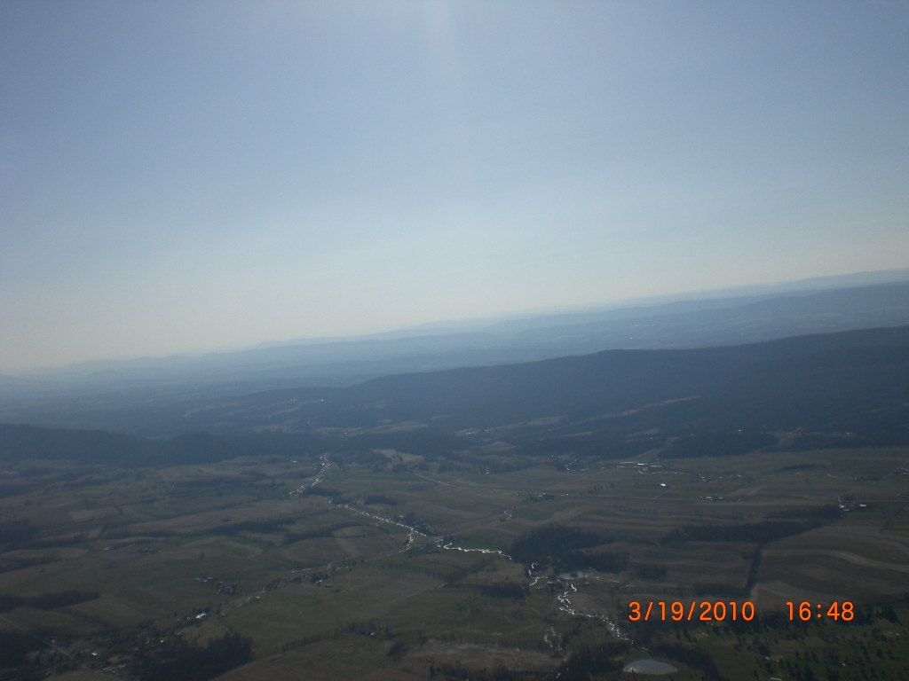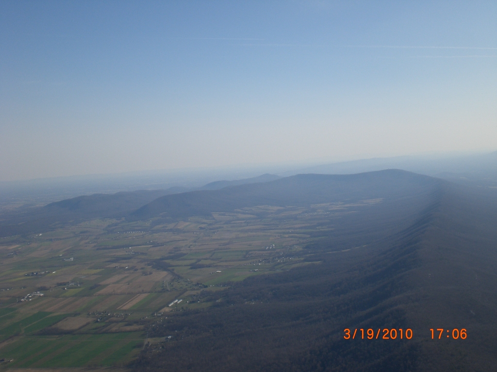 Beautiful afternoon at the Pulpit. Got there at 2:15P to find Krzyzstof and Dan set up and ready to go with Krzyzstof's nephew Mark along for the experience. Got Krzyzstof off at 2:30P and Dan 15 minutes later with Mark's help. They both got up easily in the 10 to 15 MPH mostly straight in conditions. Dan got pretty high in a nice one at 2800' over drifting back between Tuscarora and Cove Mt. He came back out in front to the middle of the valley as Krzyzstof began to climb off the ridge. As Krzyzstof stated, he got stinking high at 4K' over as Mark and I strained to pick him out in the hazy blue sky as he went OTB. Dan drifted back in some lift lower and behind Krzyzstof, then came back out front and landed to help me launch. Both Dan and Krzyzstof ironically got back to launch at the same time as I was preflighting my glider. I took off with their assistance at 4:30P and climbed up a few hundred in front of launch. Headed down to Rt. 16 and flew out away from the ridge, finding shots of lift but nothing cohesive. Just kept fishing around, gaining a few hundred here, a few hundred there, all the while heading WSW out to over the golf course. Finally found a cohesive core and got up to 4700' MSL. Flew back to the ridge and found another one directly over the spine and gained up to 5140' MSL. Decided to drift OTB with Mercersburg in my sights. Ran into lots of sink and lost a bunch searching the Cove Gap area. Headed over to James Buchanan High School and Middle School, spying a baseball, football, and a soccer field with games and practices going on. Over the blacktop found some ratty lift that allowed me to gain a few hundred up to 1800' MSL. It quit, so I decided to put down at the edge of the girls soccer practice field as a practice was going on. Had a nice landing in a 10 MPH wind, with a "TA DA" exclamation