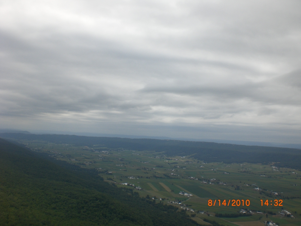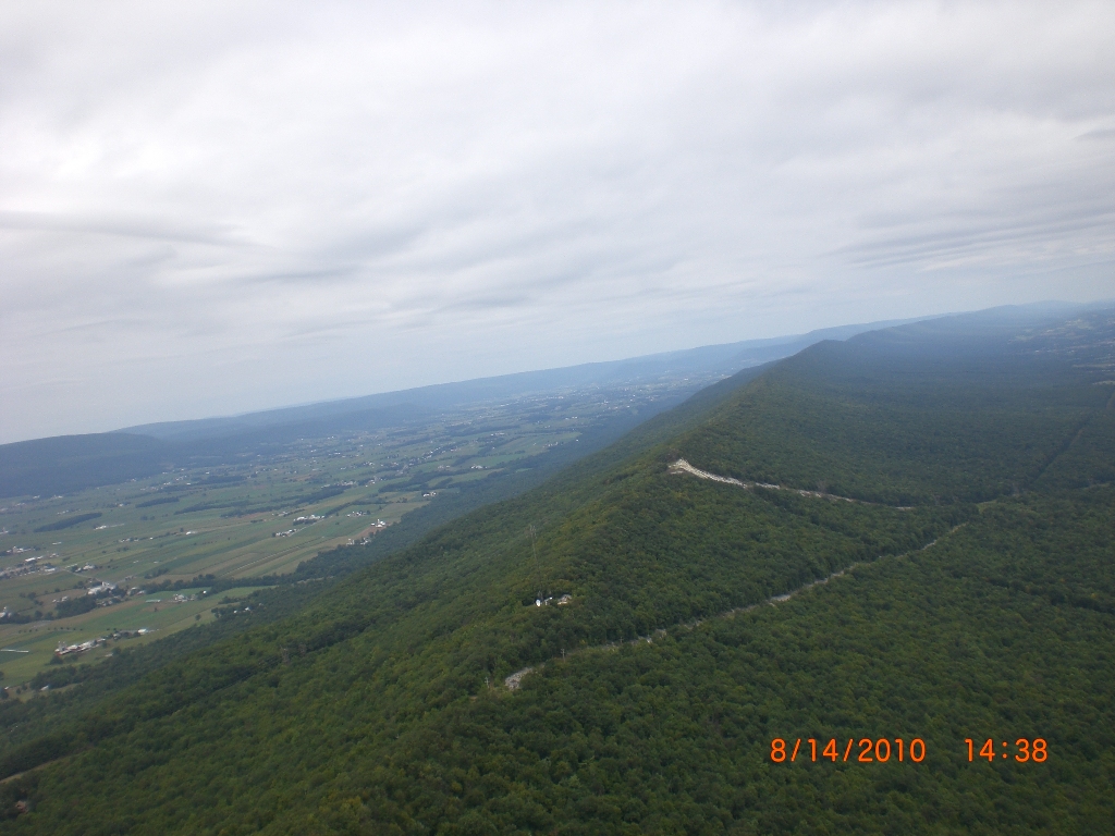 A very nice day at Jacks. Arrived just after 11A to cloudy skies and two pilots with chainsaws taking care of tall saplings near the bottom of the slot. Took a hike down the mountain and back since no flying was going to be done until we had an army there ready to tackle the waist high brush growing from the guardrail down. The army assembled in the form of 8 more pilots and the runway was completely cleared of the waist high brush and the highest saplings removed. Steve Krichten, Steve's friend Don, Mark Dunn, John Wiseman, Tom A, Shawn MacDuff, Steve Cortez (visiting pilot from NM), Daniel, Paul Donahue, Spoons, and I comprised the army. We finished at 1:30P and started setting up. It was blowing nicely up the now groomed slot. I launched first at 2P and worked to get up. It took some good effort to get above the ridge but once above it was golden. Gained a few hundred and flew back over launch and waved to a large group of Amish folks that had arrived just after I took off. I flew back to that nice rockpile where I gained the few hundred and gained some more. Drifted up the ridge and found another rockpile that was working and got my highest gain to 900' over. Crossed over the power lines with this gain and repeated the process over successive rockpiles up the ridge. However, never got more than 600' over. Got up to near the Rt. 322 gap and spied the Mifflin County Airport. Loitered in the area for a good while trying to find a climb to a good height to make the airport. Where I was, the wind was more out of the ESE. So I theorized that there wouldn't be much rotor if I went OTB at a lower altitude. Found some lift that got me to 300' over and drifted with it OTB. I promptly lost it so I committed and there was a little chop but manageable. My track for the airport had plenty of fields but nearly all of them had crops (corn, soybeans, alfalfa). I spied a cowfield in the distance, and a clear area next to a house by Rt. 655 that I could put down in. At the decision point for either field I hit some lift that gave me enough altitude to make it to the cow field. It was cut in half by an electrified fence, and the upper half was downhill, so I just flew over the lower half and turned gradually to the SE and had a nice landing, about a half mile from the airport. Two young girls about 12 years old came running over to the edge of the field to see if I was OK. They were on a back porch and saw me fly into the field behind a big tree and they thought I was going to hit the tree from their vantage point. Finagled a ride back to launch from one of the girls' father, storing my equipment in their yard just across from the cow field. Back at launch a group from a family reunion in the Ferguson Valley marveled at the gliders soaring and landing. They witnessed Paul soaring around launch and going in as the last of the group to land. Retrieved my stuff and high tailed it thru the Rt. 322 gap and down Ferguson Valley Road. At the LZ plenty of smiles were around. Spoons got a climb to 1800' over, and a mature bald eagle was seen by Daniel and John. Daniel and I broke the long drive home up with a stop at the Mountain House Bar and Grill for some chow and a few beers, studying the relief map of Jacks Mountain that I flew with. A few pics to follow.