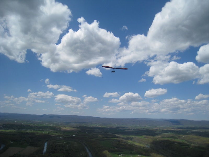 Around 1:55 pm, with Randy and Larry as an able launch crew, had a nice launch into 8 – 10 mph, and after clearing the slot went on a sporty elevator climb at 600 fpm on the 5 second averager. Flew towards route 11 to get out from under a sizable cloud, with its attendant lift at 550 to 650 fpm. Strong lift and winds continued as I flew out from under the cloud and away from the ridge, but even with 3/4 VG (Litespeed RS 4 topless), and the basetube pulled in to mid tummy, progress was slow. Approaching the bridge field at about 1,000 ft over ground, it took some searching to find sink, which I cored, and got down to a nice landing in the bridge field. The flight lasted a lively 20 minutes. I could see Randy’s set up glider on launch, so I called and recommended that he wait for conditions to mellow.