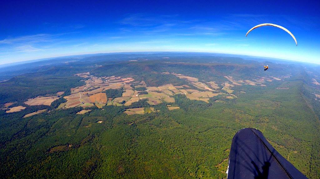 Day three was really fun. Buncha PGs at Bills. The overgrown slot was a bit of a challenge but most PGs launched OK and several got up and away. Four of us gaggled up and took a slow (L&V!) XC route first south along the ridge then west past Breezewood. About 30 km and just under 4 hours. TOL ~6k'. Beautiful L&V soaring conditions with moderate and abundant thermals.