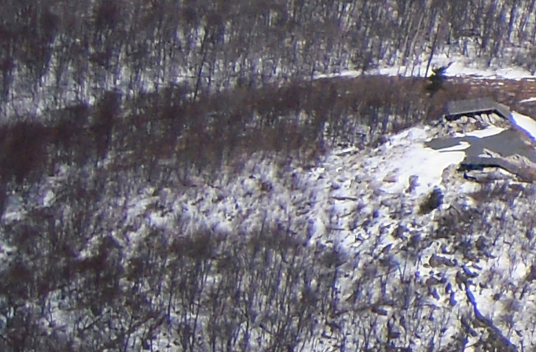 Here’s a March 7th 2010 image of takeoff that should help define what area below launch needs to be cut/trimmed. With a little imagination (sorry for the poor resolution), one can see the cleared boulder field below the rocks next to launch. The second copy highlights the area that needs to be cut if we want to bring it back to ~2010 conditions. By cutting down/trimming the trees within the triangle, I believe that we will improve the launch.