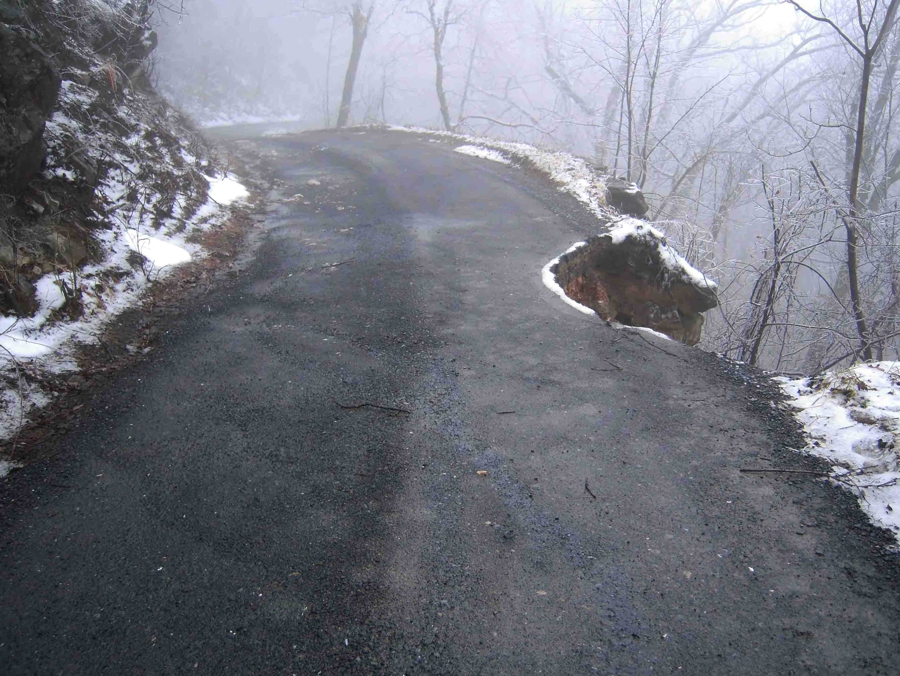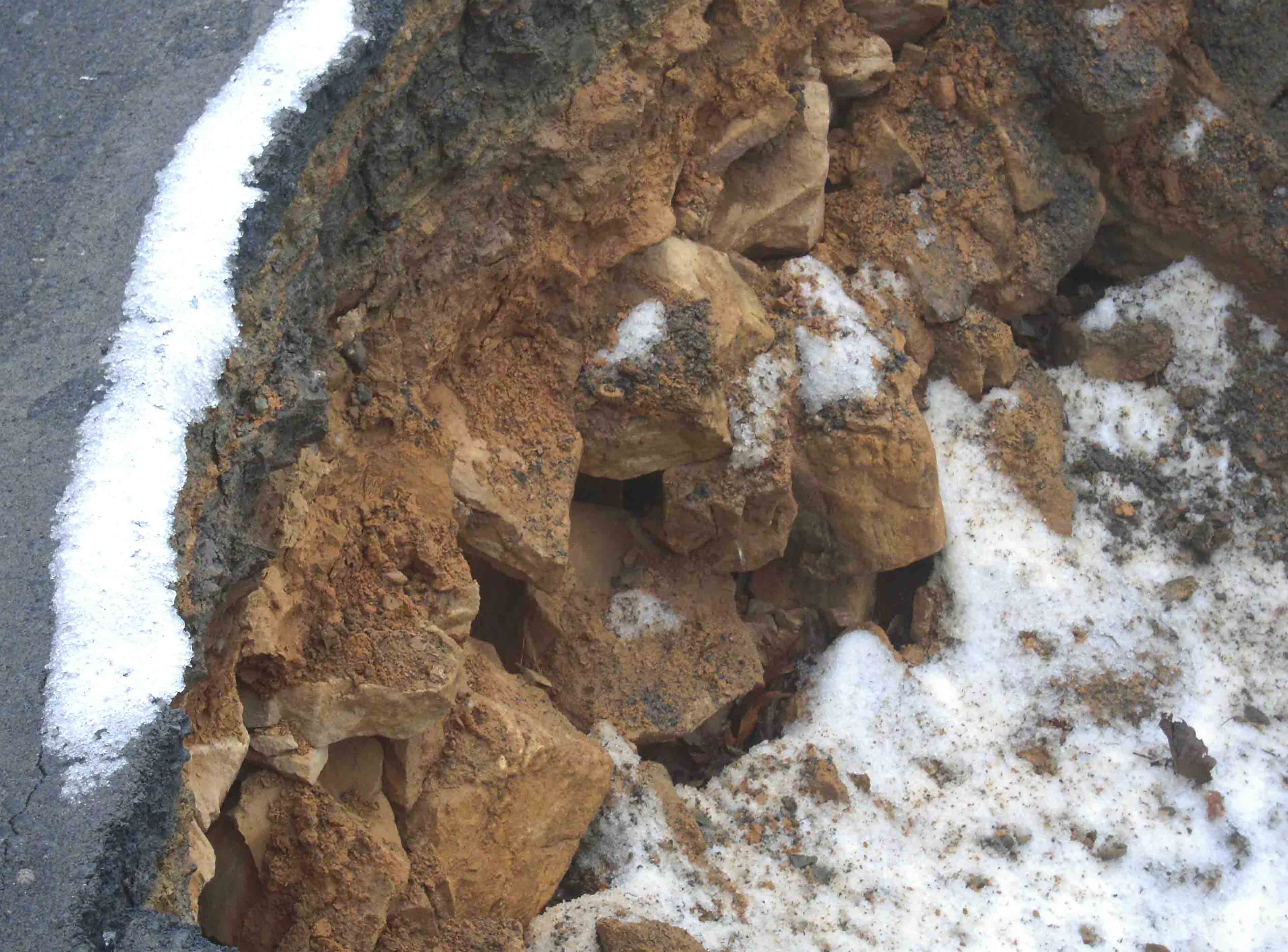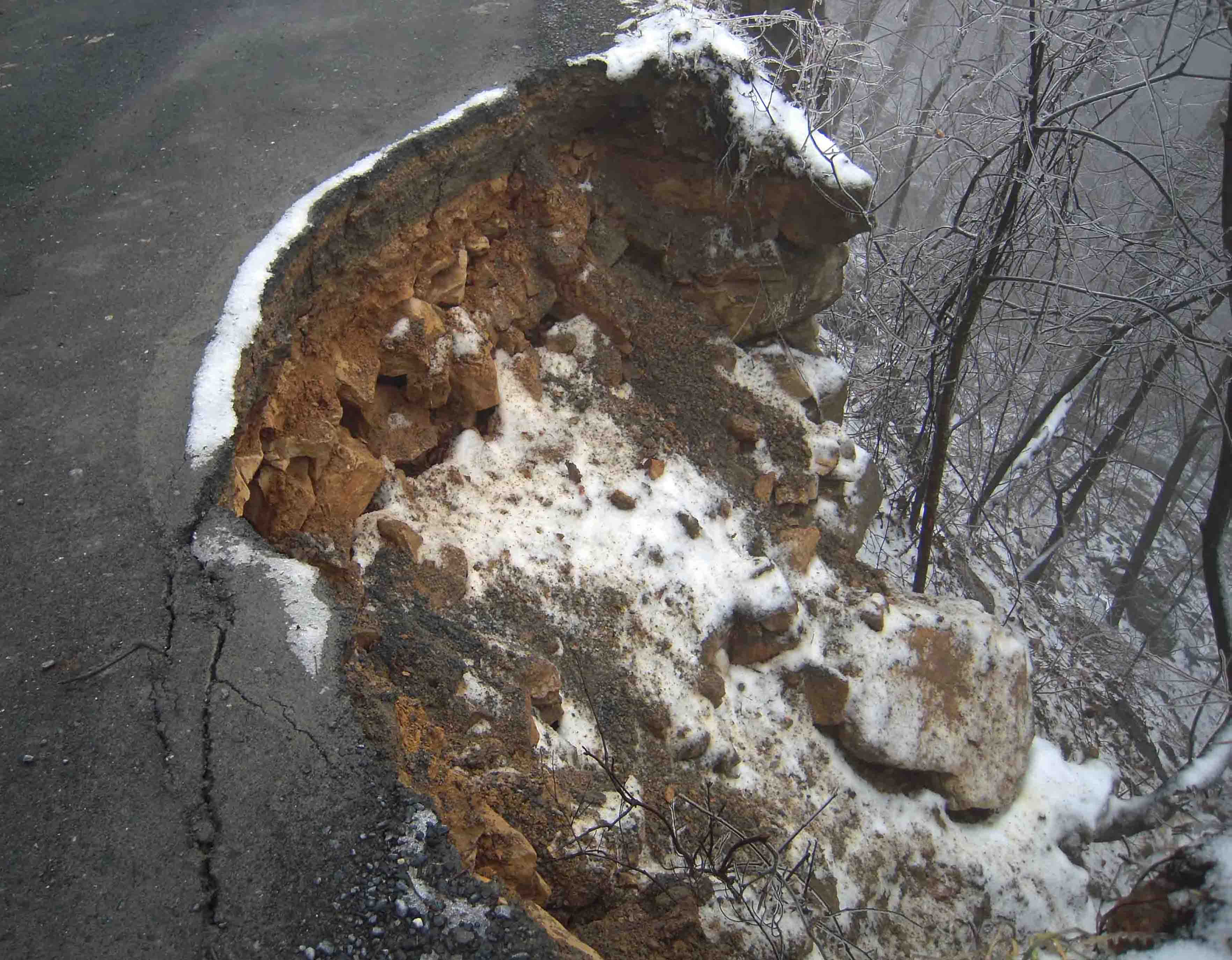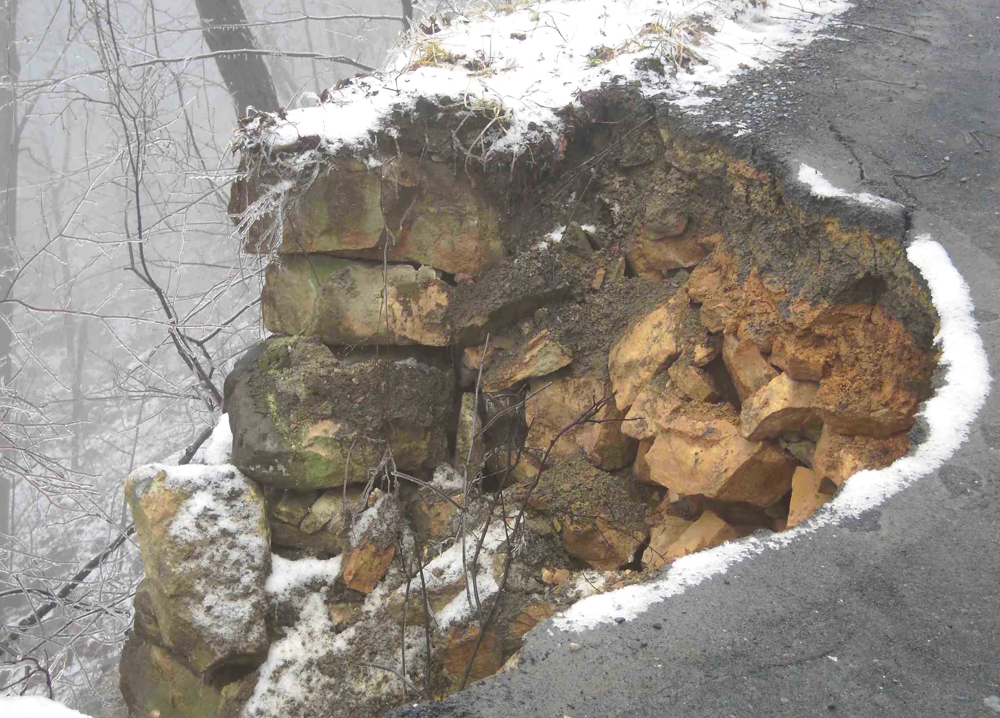 Image #3: The large snow covered boulder (lower right) was most likely part of the retaining wall. Also note, the cracks in the pavement suggesting that the collapsed area is unstable and growing.