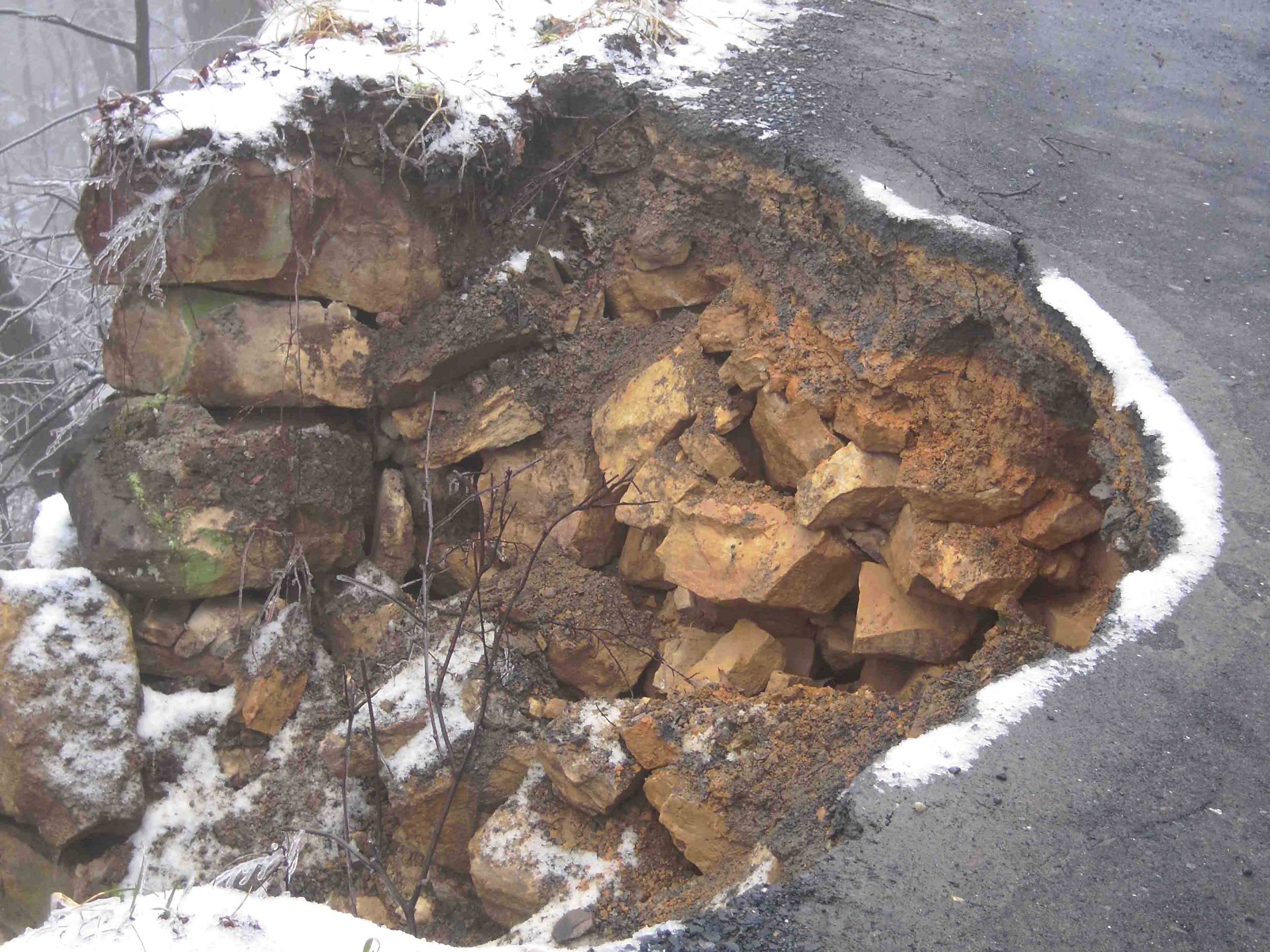 Speculation -> once the retainer wall collapses, the road’s underpinning made up of smaller, irregular shaped randomly stacked rocks lacks the structural integrity to maintain the road.
