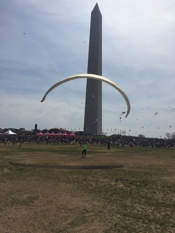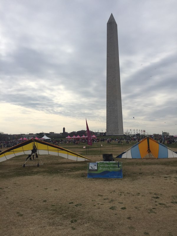 From Tommy Powers, "For those who made it out to the Blossom Kite Festival, we could not have asked for a better day! We had some prime real estate for glider display, and if Donnie had taken a look out the back window of the White House he would have seen us CHGPA folks in his direct line of sight to the Washington Monument. We even got some special attention from the Secret Service on this one! Many thanks to Krista Auchenbach, Lisa Davis, and Jeff George for coming out and getting some kiting demonstrations in. We even had our own “Kite Club” kiting area set up by the Park Service just adjacent to the HG displays! Once kiting began, we had a lot of interested people inquiring about our sport. The crowds were pretty massive for the day, and I was able to get my very slowest bike ride ever around the mall after the event, but one of the most satisfying rides ever. The cherry blossoms were in full bloom and never have I seen such a gorgeous display in all the years attending the kite festival. Many thanks again to Krista, Lisa, Jeff, and all the other club members who stopped by for their annual checkup and kite fix – we really had a great day! "