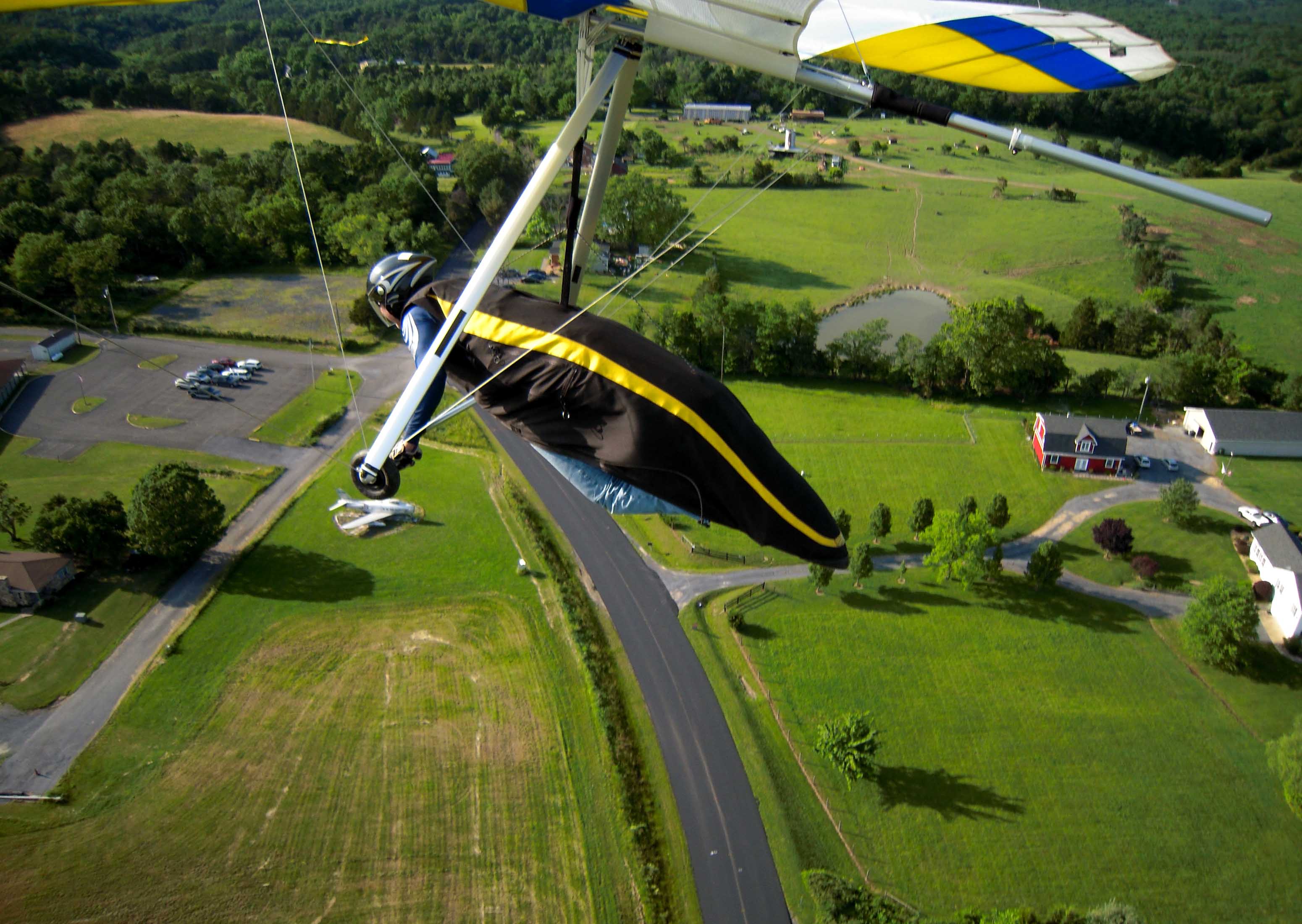 Since the road is closed it is less convenient to land out front. Ward and I had a plan to land out at the Front Royal Airport. Earlier flights by Joe, Gary, John and Walt were not producing the altitudes (4K MSL) that would make it an easy flight. Fortuitously, flying later proved to be a good option. Ward launched first sometime after 4PM (thank you Gary!). I launched last and we both got up easily and made our way to the north. Solid ridge lift with intermittent thermals made it a pleasant trip. Ward and I flew cooperatively marking lift for each other. I have some good air-to-air footage. We staged by the point and I got a couple good climbs and could have drifted back and climbed even more. I went back out front of the ridge as Ward appeared to be heading back to the main LZ. I did not want to get separated so I followed. Unfortunately, I spotted a finely feathered Bald Eagle below me and my selfishness took over. I could not resist to fly in close and climb in the best thermal of the day. I floated with this colleague back over the valley to 5.3 K MSL and easily had the airport.